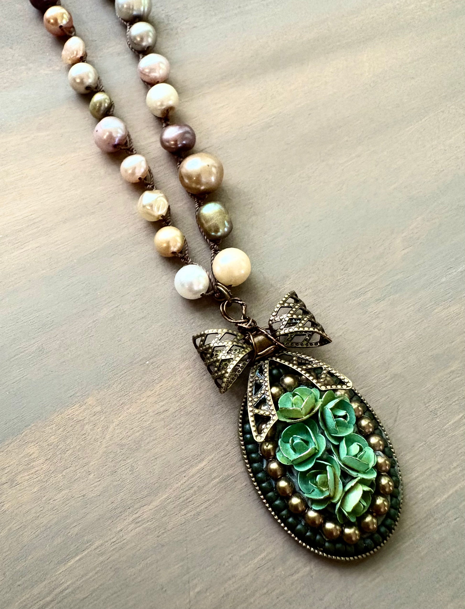 One of a kind. This handcrafted pendant features handpainted metal flowers set in an ornate filigree bezel, topped with a French bow. The pendant is paired wa mixed freshwater pearl strand, knotted with many different shades of color. Necklace measures about 18" long with button and loop toggle closure.