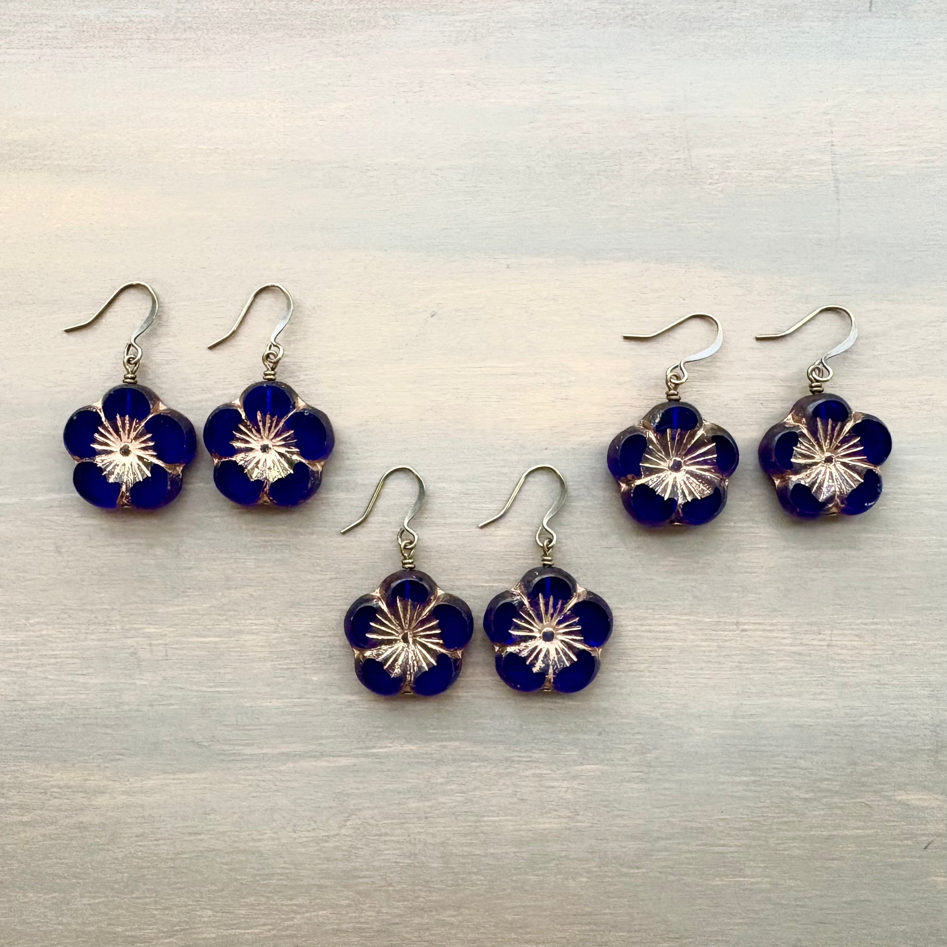 This deep blue is so dark and rich and the coppery gold highlights add a wonderful glimmer to cut glass. The flowers are crystal glass from Czech Republic and are created from antique molds. Each flower measures just under an inch in diameter so they are the perfect size to be really eye-catching without being too heavy. Hypo-allergenic base metal hooks with backs. Earrings come carded. Listing is for one pair.