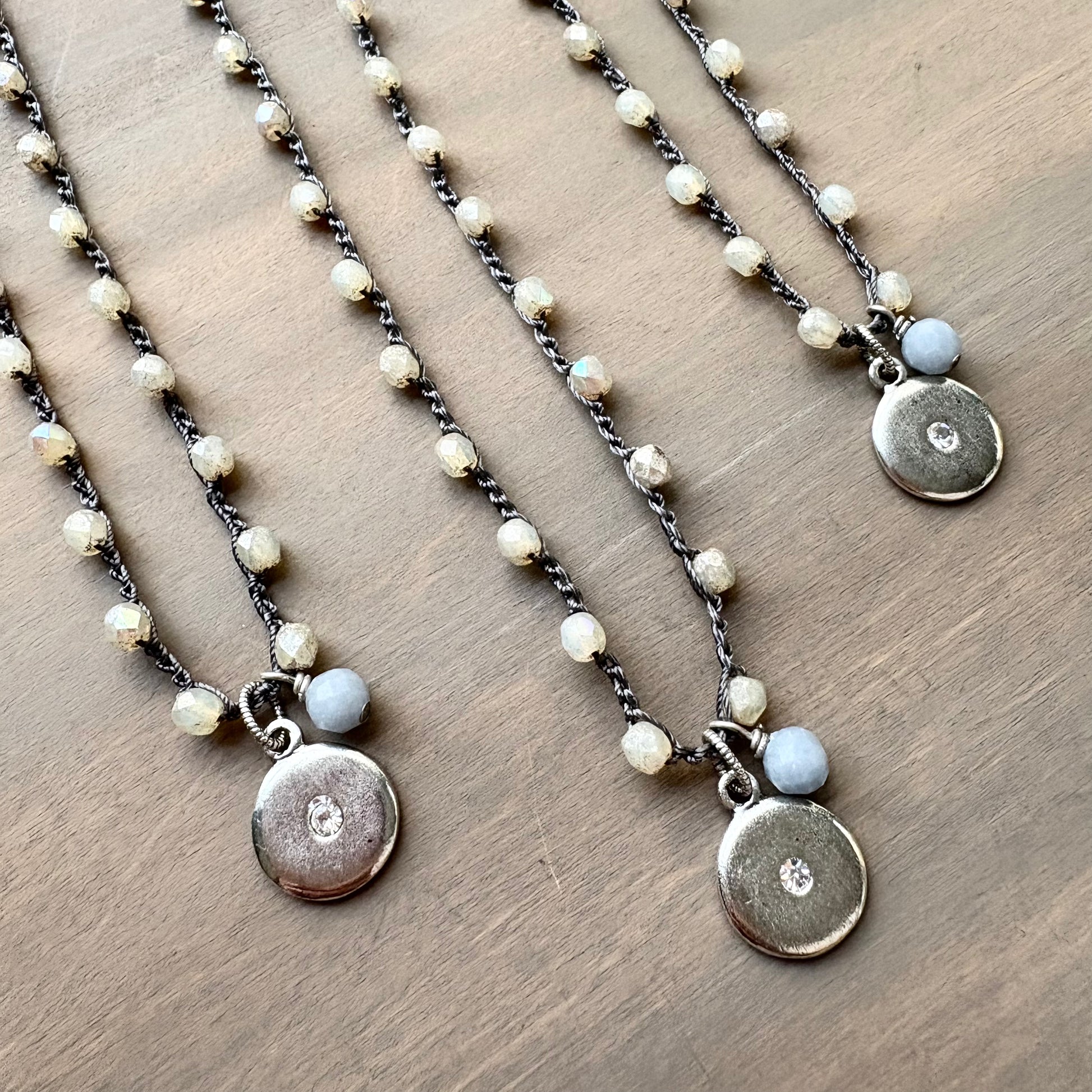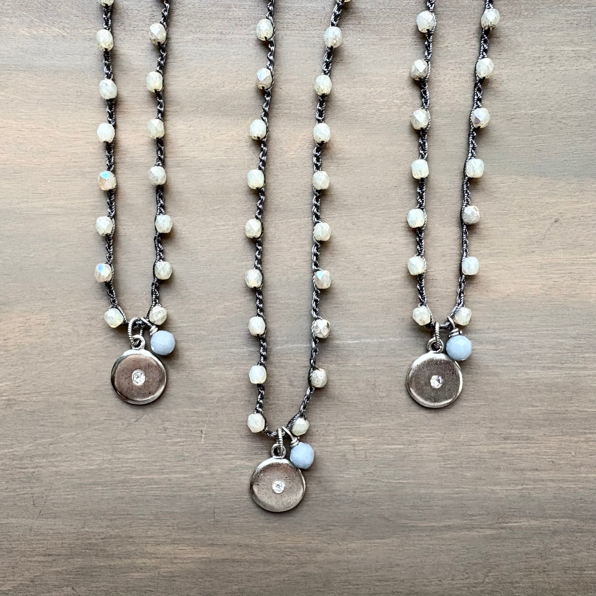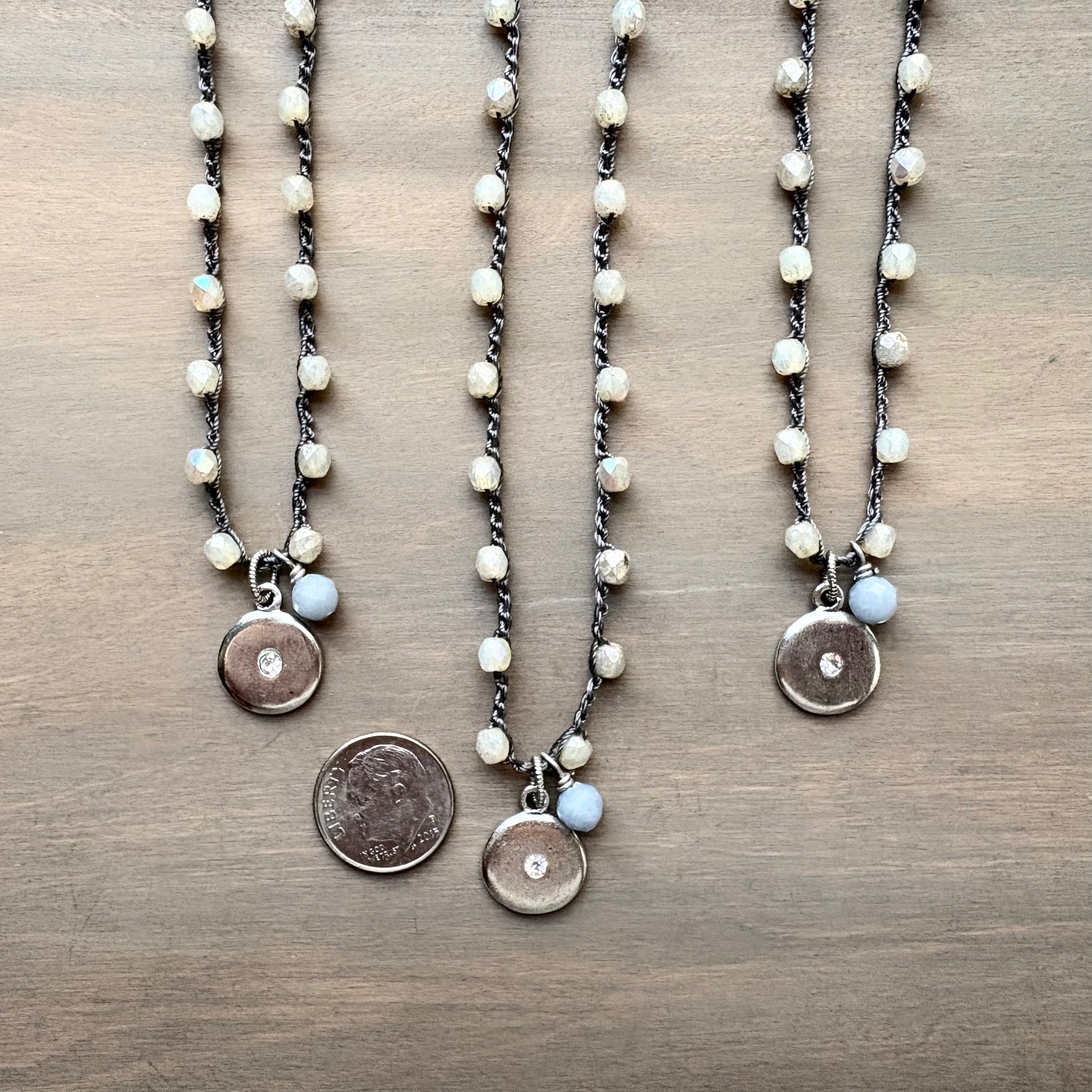 Inspired by the mighty dandelion, one of my favorite flowers! Silver plated circle with a cubic zirconia crystal in the center is paired with a crocheted strand of opalescent Czech crystal and a single drop of faceted angelite. Necklace measures about 19 inches long with mother of pearl button and loop toggle closure. Listing is for one necklace.