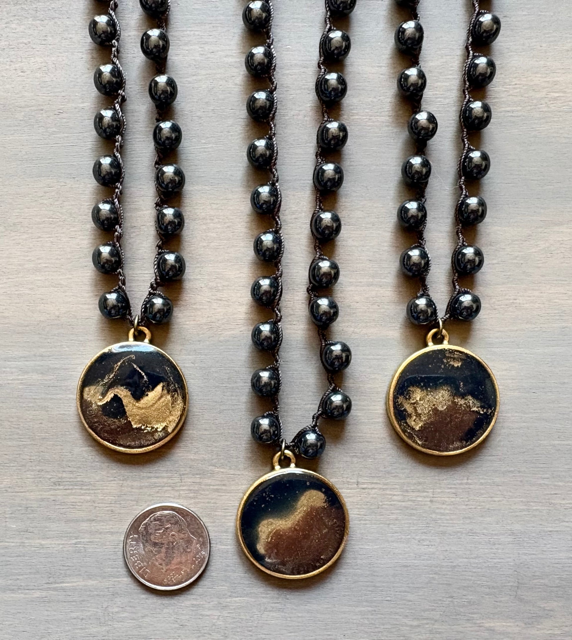 Up high in the mountains, with no street lamps or tall buildings to spread artificial light, the sky is lit on cloudless nights with billions of points of light traveling through light-years for our eyes to see. It is pure magic, and I tried to capture a bit of that idea in this piece. Deep blue, dark, dark crystal—not quite black—crocheted on an earthen cord. Necklace measures about 24" and features a mother-of-pearl button and loop toggle closure. Listing is for one neckace.