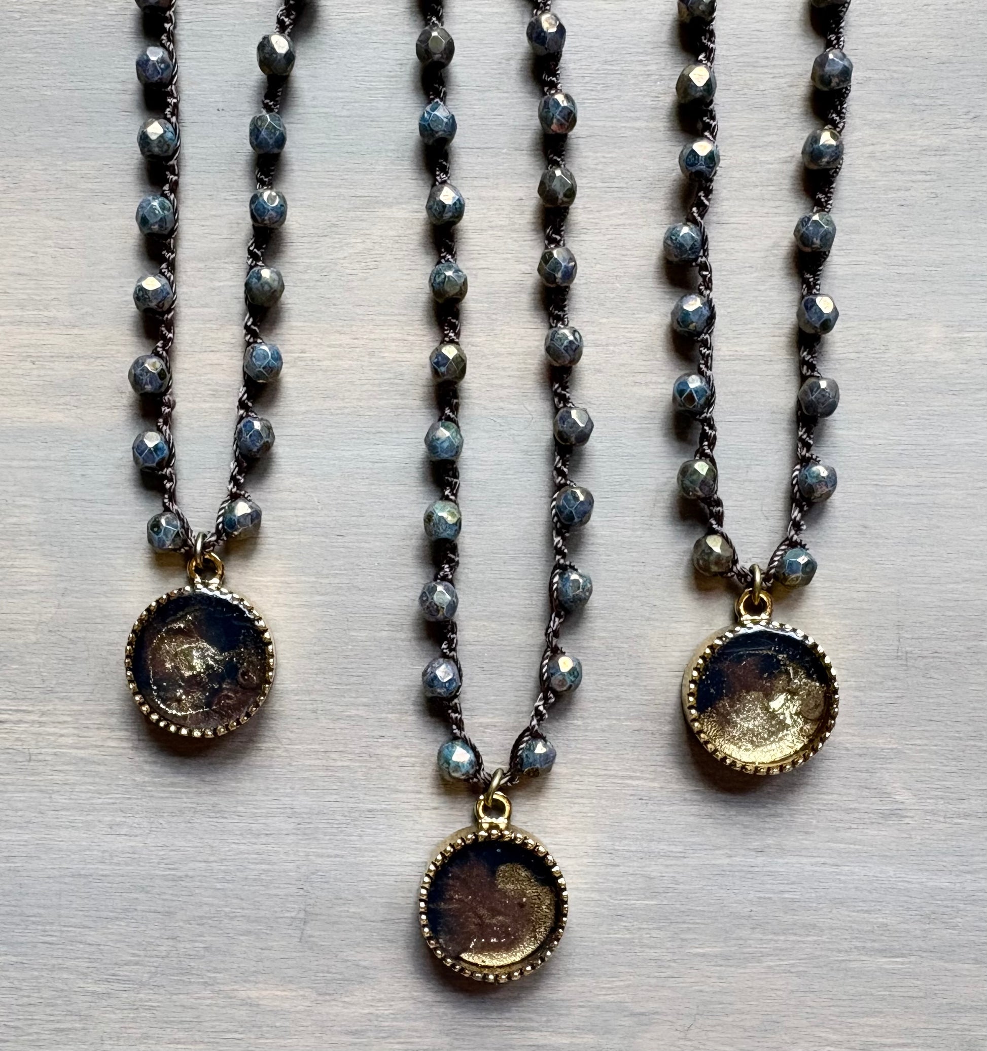 Up high in the mountains, with no street lamps or tall buildings to spread artificial light, the sky is lit on cloudless nights with billions of points of light traveling through light-years for our eyes to see. It is pure magic, and I tried to capture a bit of that idea in this piece. Deep blue crystal crocheted on an earthen cord --- I love wearing this piece layered with the Mountain Escape necklace in the last picture (sold in a separate listing). Necklace measures about 17.5" long and features a mother-of-pearl button and loop toggle closure. Listing is for one neckace.