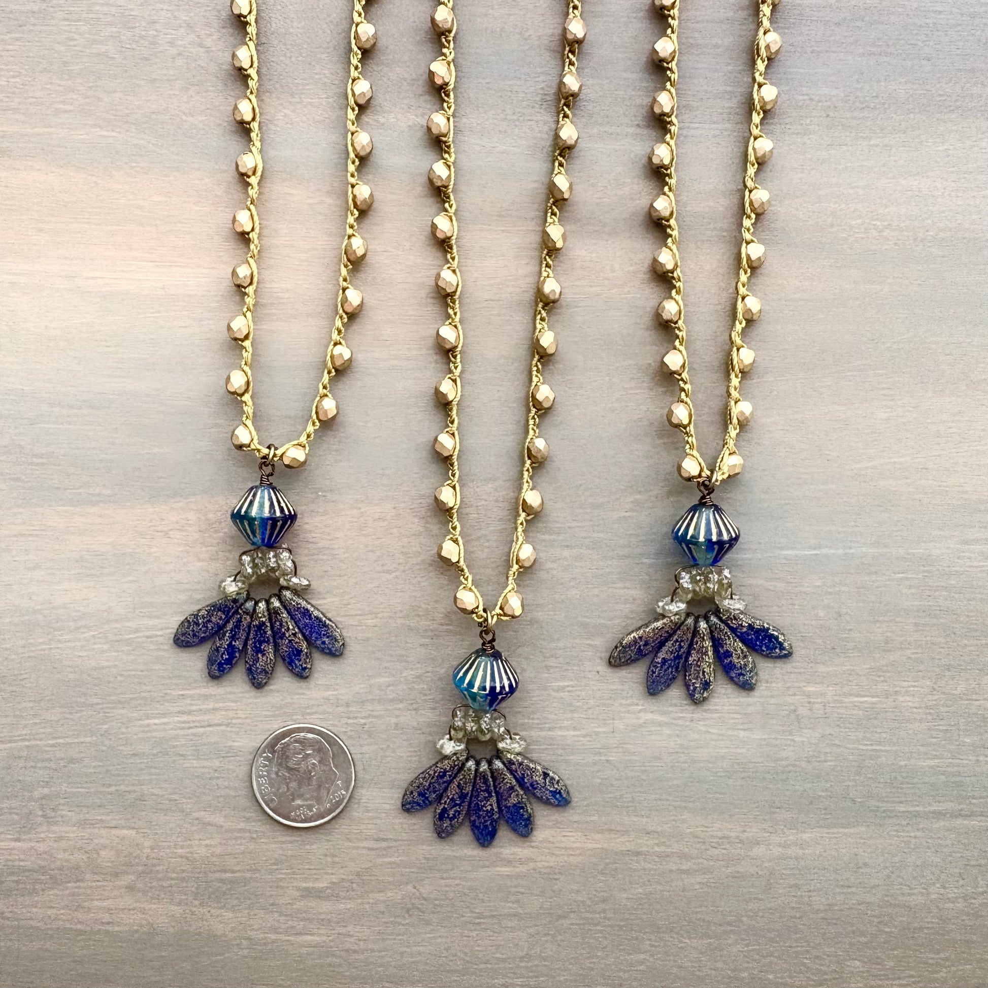 This necklage features a deep indigo denim shade paired with a crocheted strand of shimmering gold Czech crystal. Pendant measures about 1" wide, necklace is about 18" long with button and loop toggle closure. Listing is for necklace. Matching earrings available in separate listing.