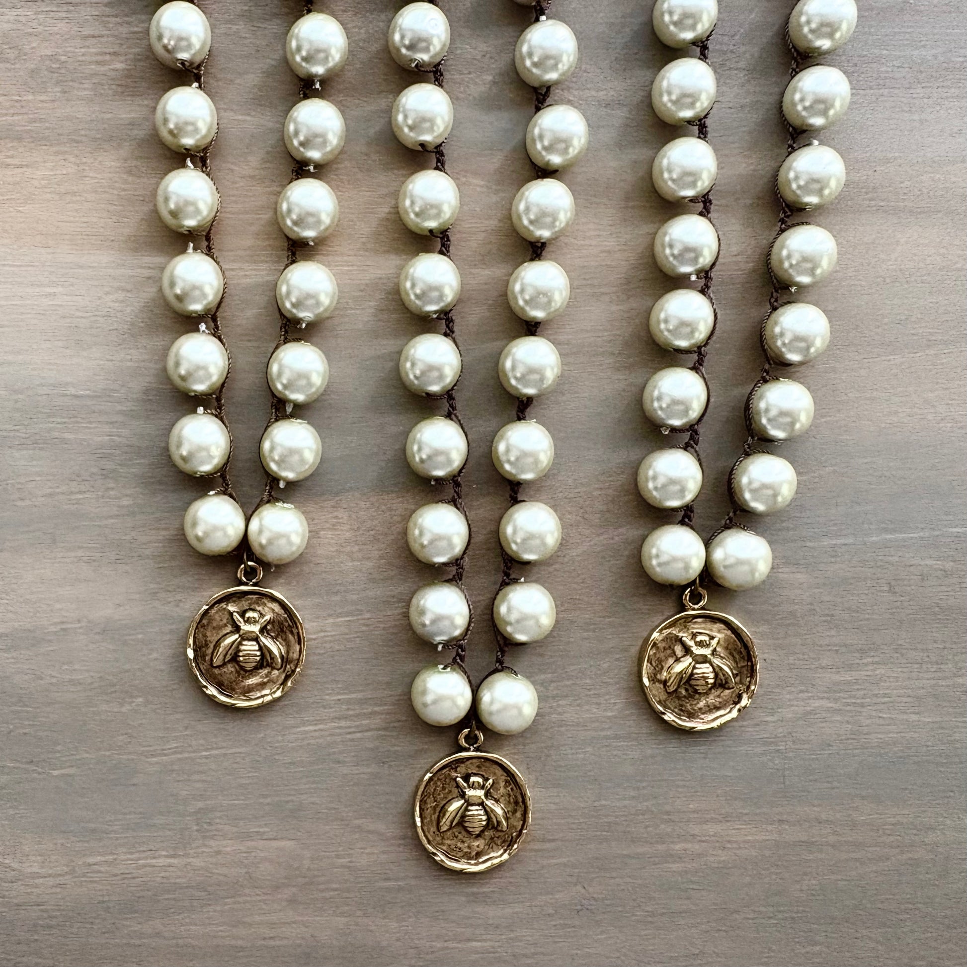 This sweet, golden bee on a strand of crocheted glass pearls measures 17.5- 18" long. Perfect on its own or layered with other styles. Button and loop toggle closure. Listing for one necklace. Matching pearl drop earrings available in separate listing.