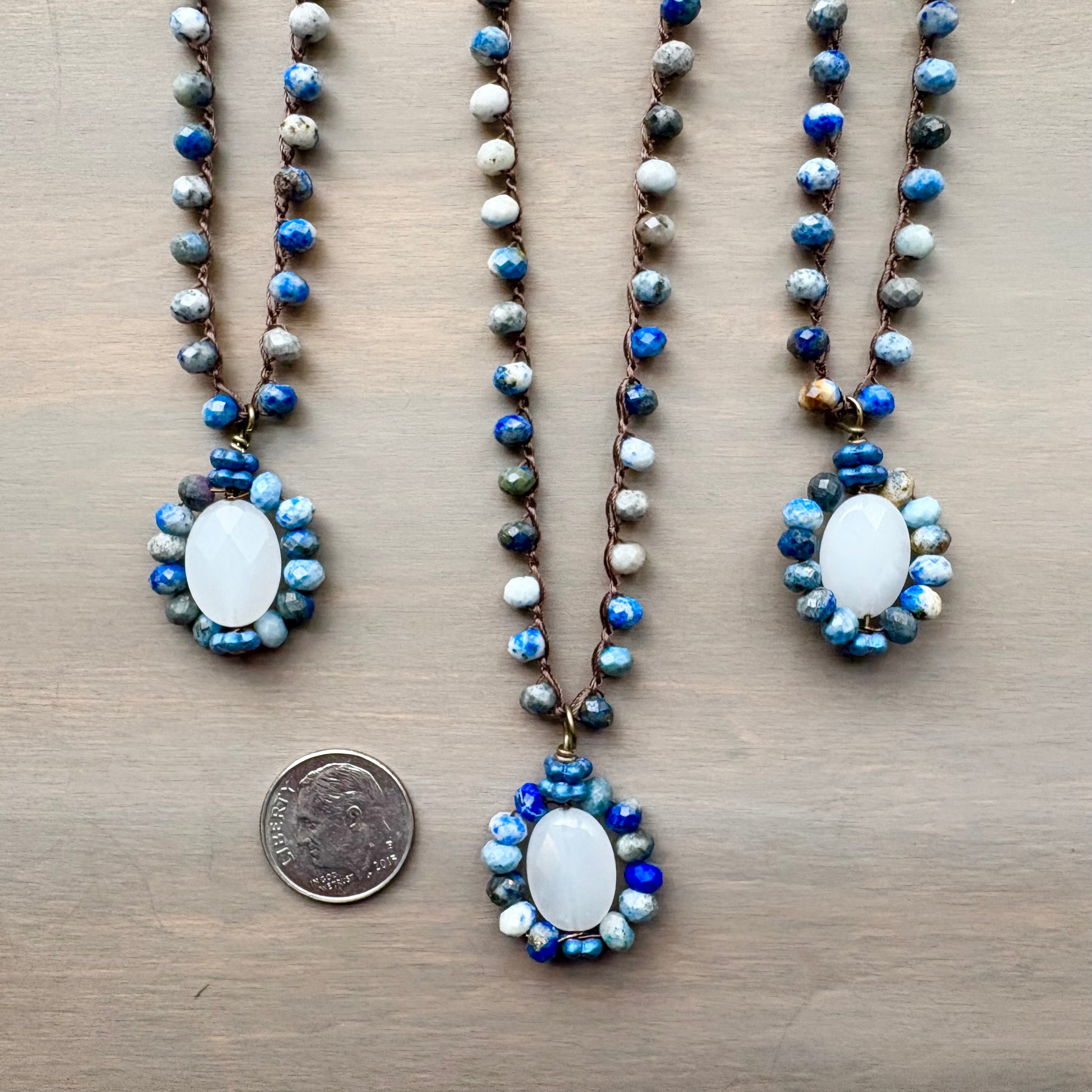 These stones grabbed my attention with their deep, dark blue tones and white accents. The colors immediately reminded me of the Maine coastline in winter, right after a snowfall. One of my favorite places to be! This crocheted necklace features faceted agate and quartz and will surely be the perfect piece to pair with jeans all year long. Mesures about 17.5" long with button and loop toggle closure. Listing is for one necklace.