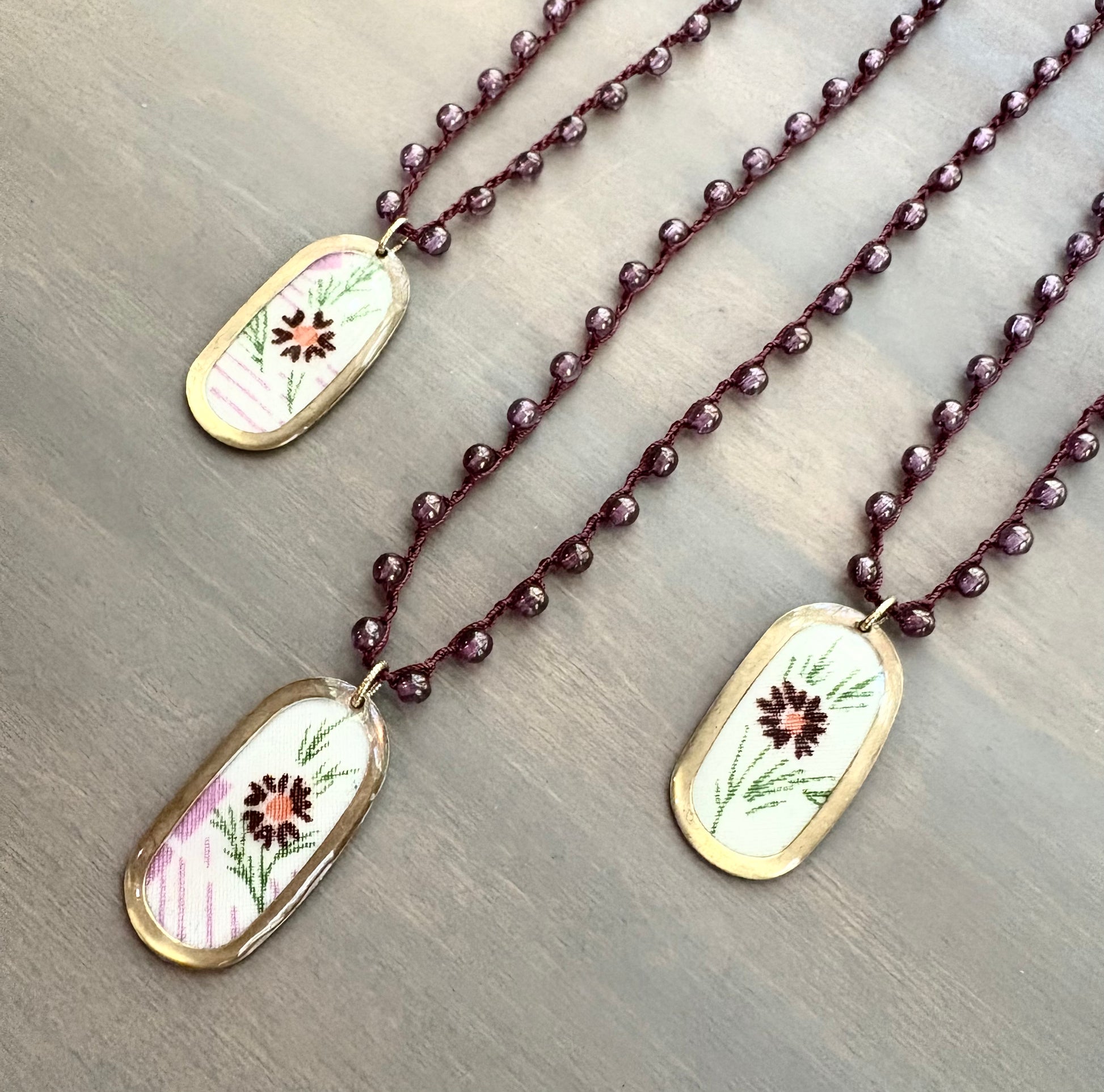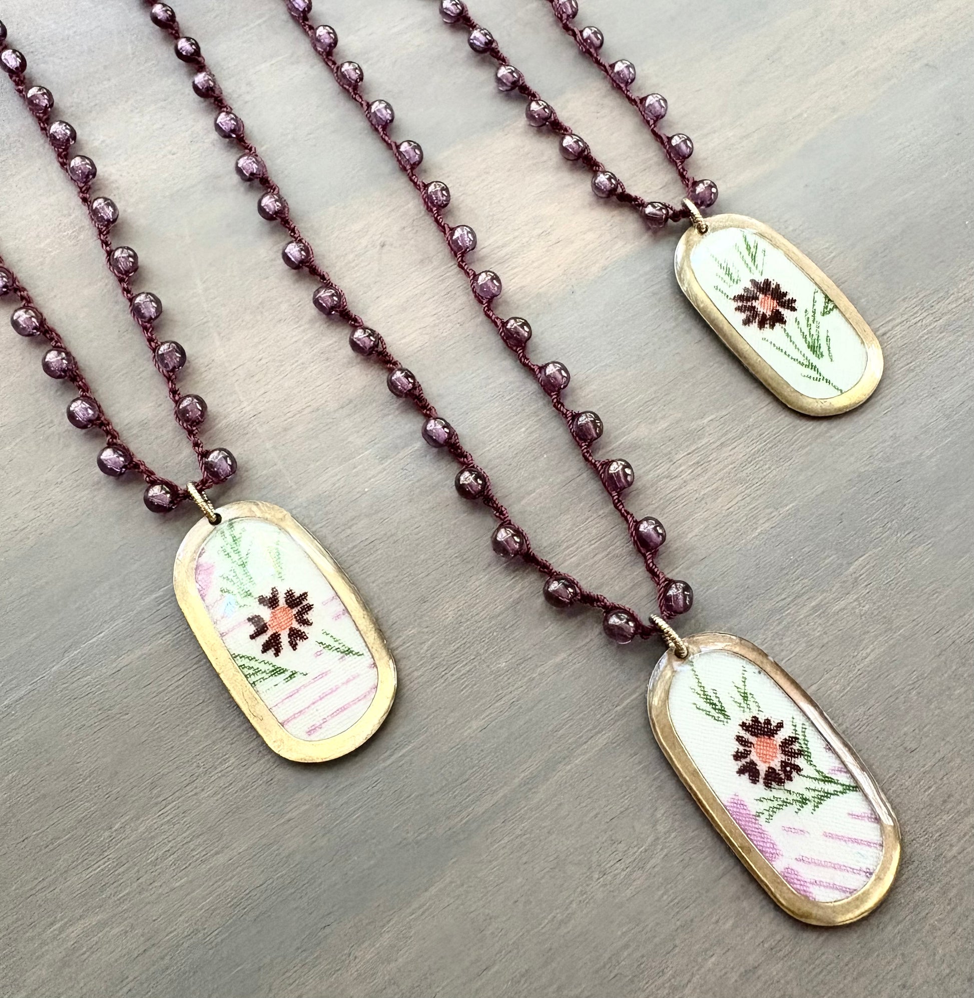 Each pendant is one of a kind, handcrafted by layering linen fabric I collected at a market in France with glass - and paired with a crocheted strand of Czech crysta in a delicious mulberry shade. Button and loop toggle closure. Listing is for one necklace. This is a limited collection. 28"