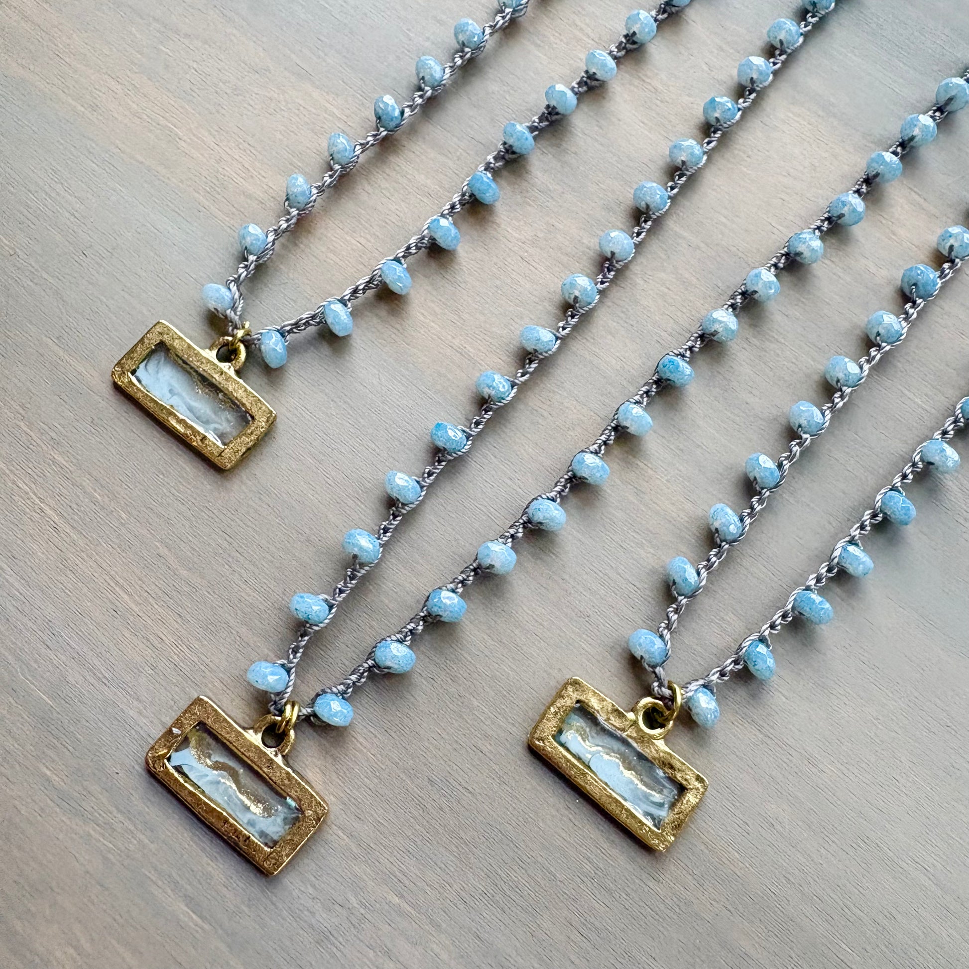 Faceted Czech crystal in soft cornflower blue are the perfect accompaniment for this handmade portal-style, landscape pendant featuring layers of pigment in soft blue and accented with drops of gold flake and German glitter. Each is one a kind and filled with bubbles and striations to mimic water and sunlight glinting across a portal window. Button and loop toggle closure, necklaces measures about 18" in length. Listing is for one necklace