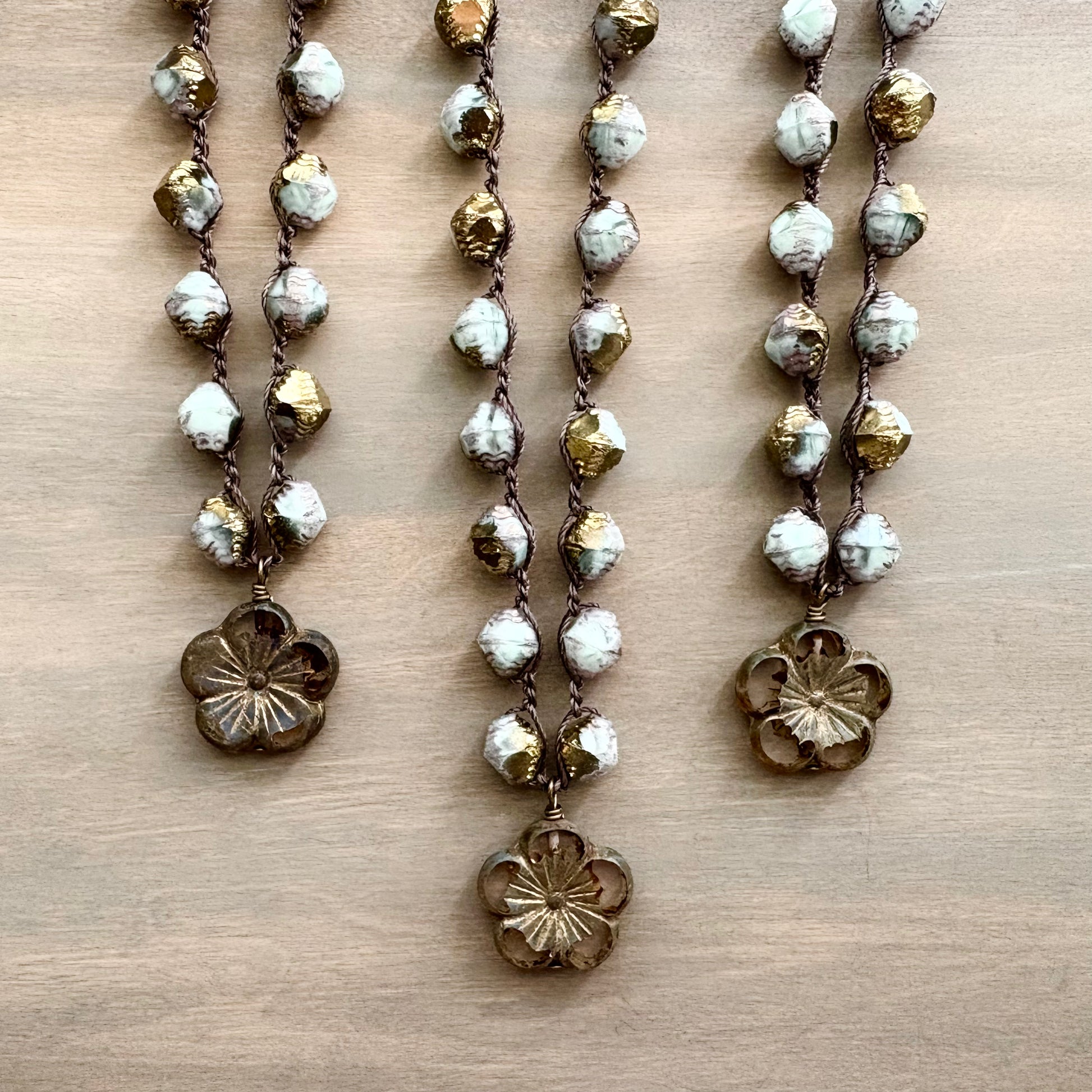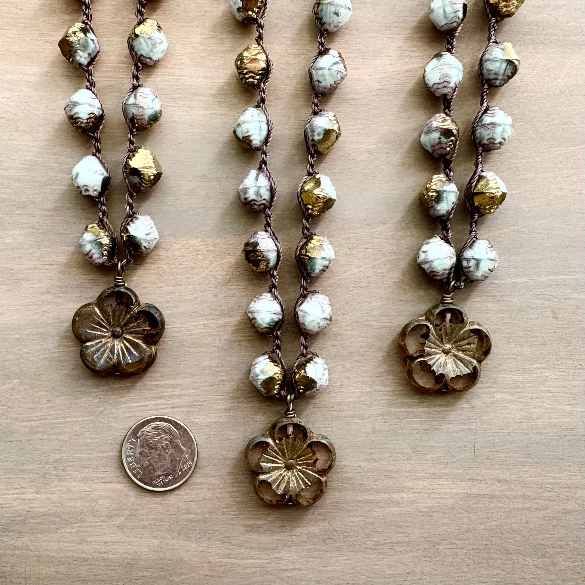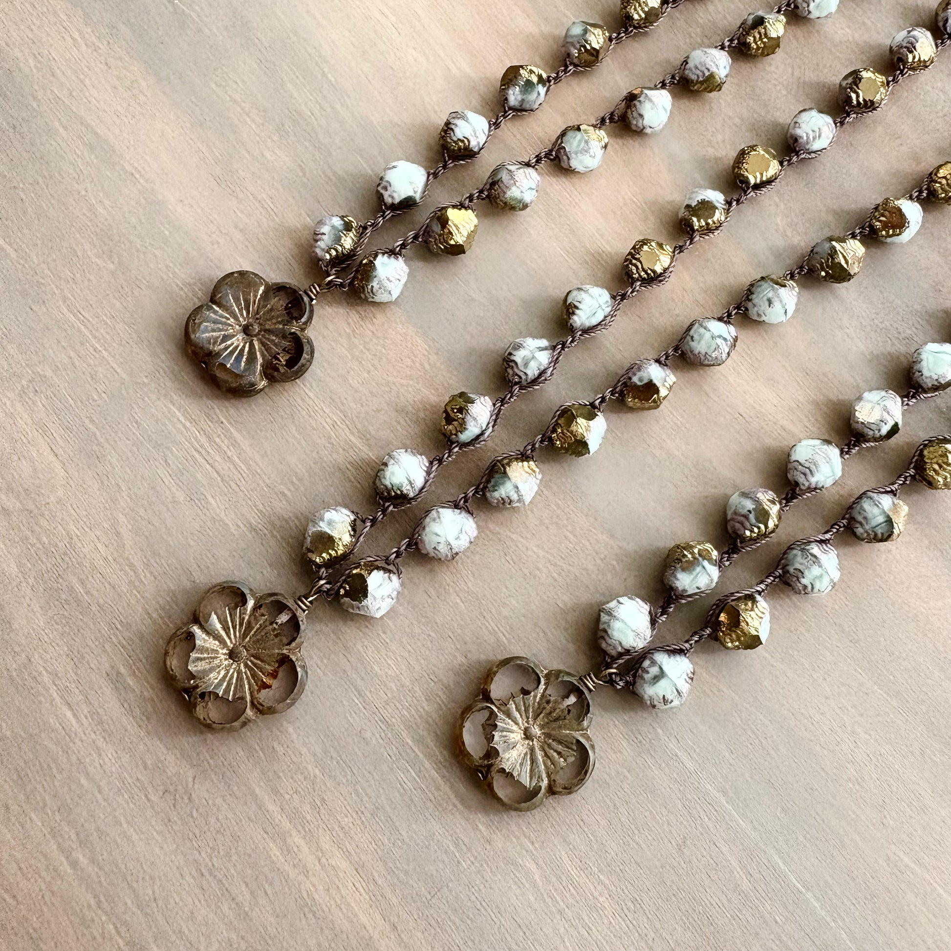 Such a good neutral but with just the right amount of sparkle. The shimmering gold on these sky blue crystals adds a rich touch. I love the translucent smoke color of the cut glass flower which was created from antique glass molds in the crystal factories of the Czech Republic. Crocheted strand features a button and loop toggle closure. Listing is for one necklace.