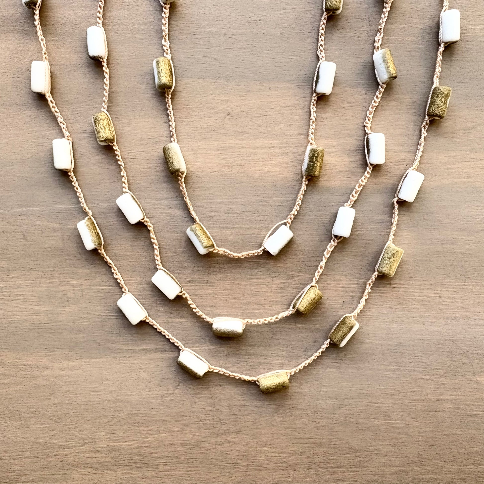 What a fun piece! This is a shorter necklace at 17" and perfect for laying with pieces you already have, or to add a bit of texture and shine to any outfit. These bluish/white cylinders have a delicious gold wash and are crocheted on a sandy colored cord with button and loop toggle closure. The listing is for ONE necklace, we just like to show them all layered up. BONUS: depending on the size of your wrist, you can also wrap this style for a bracelet!
