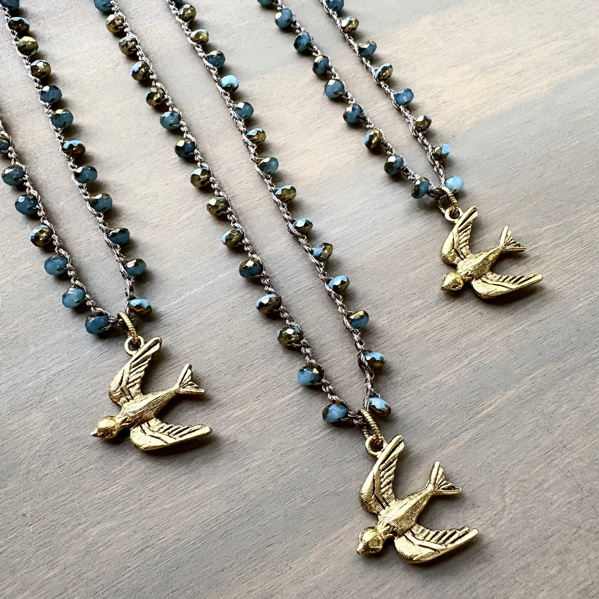 These faceted Czech crystals in the loveliest shades of earth and sky, are adorned with a handcast bird charm. This beautiful double sided bird charm is so detailed and very symbolic. I especially love it for friends whose kids are "leaving the nest". Necklace measures about 17.5" long with button and loop toggle closure. Listing is for one necklace.