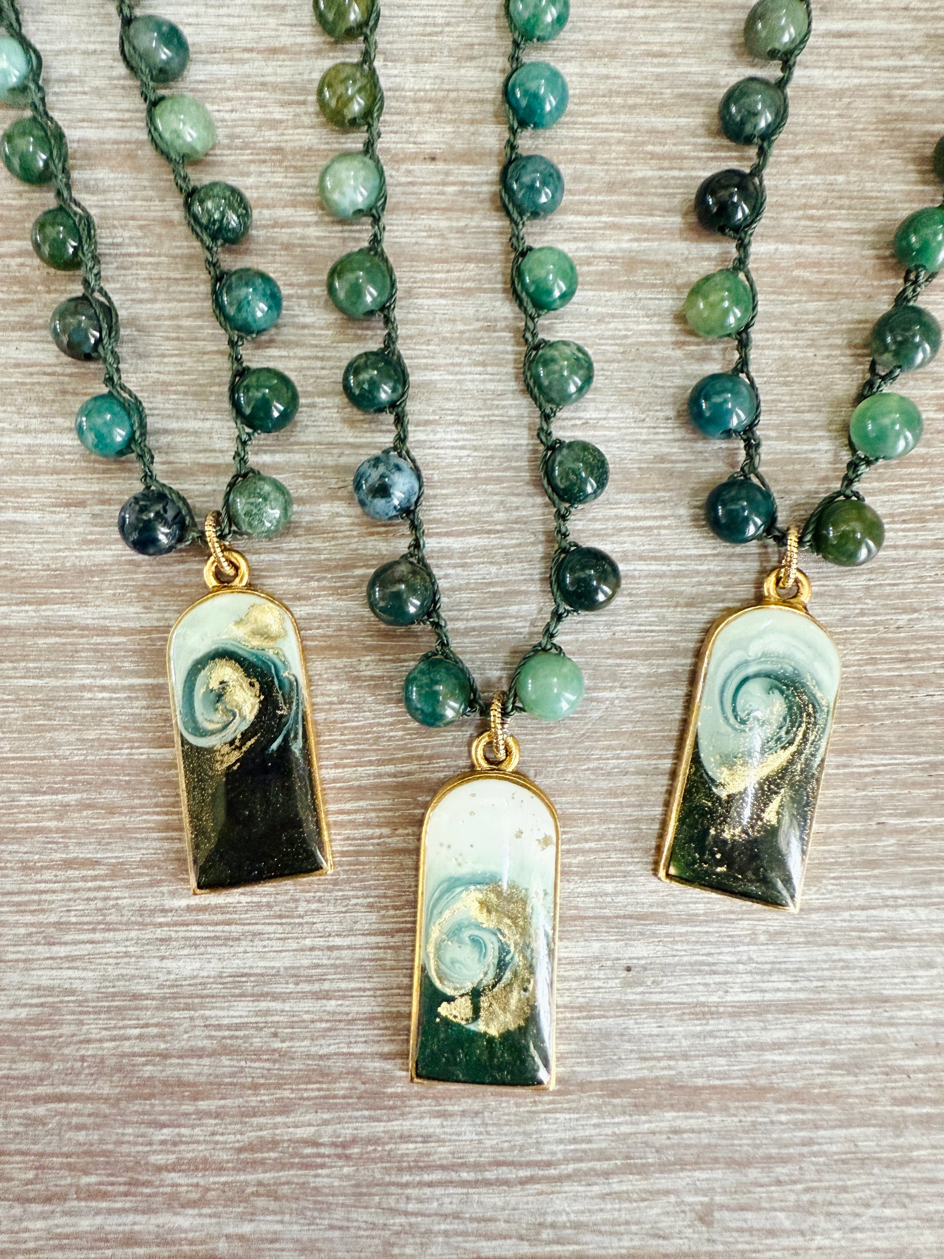 Aventurine represents luck and opportunity and I love it knotted on this rich cord and featuring a handcrafted, green wave pendant (each pendant is one of a kind) that I created by layering pigments and gold flake. Each pendant is about 1.5" long and the crocheted necklace strand is 20" with a button and loop toggle closure. Listing is for one necklace.