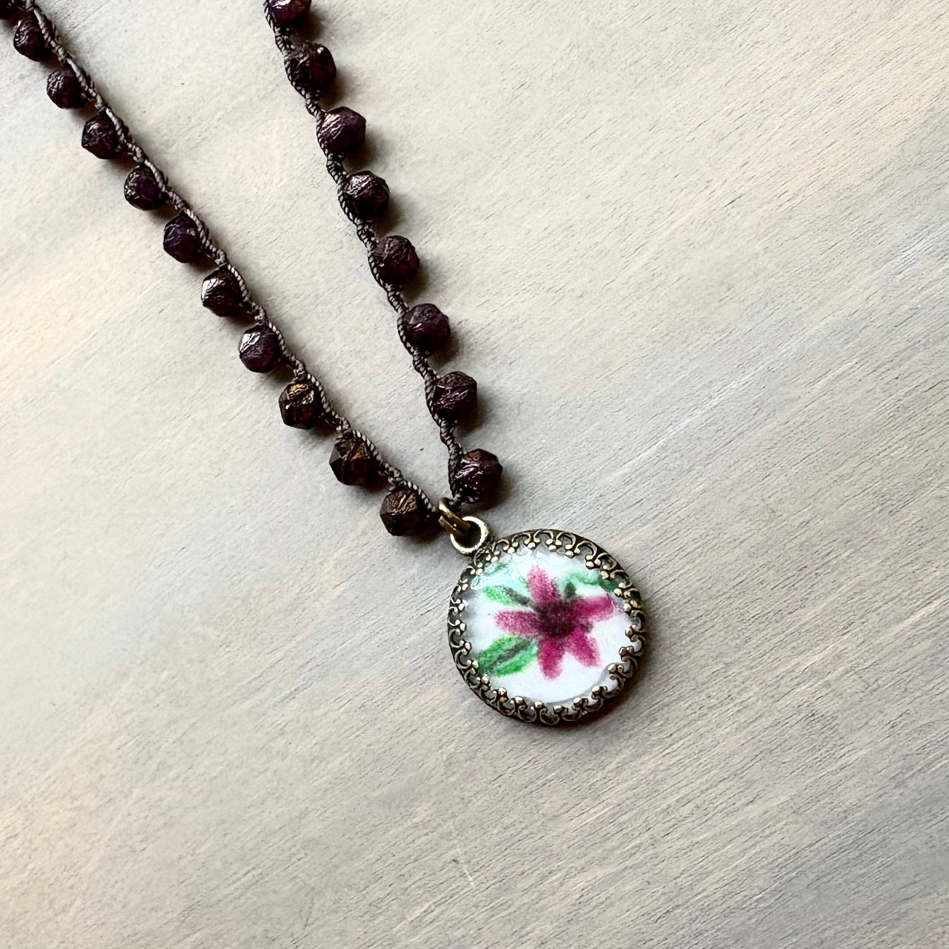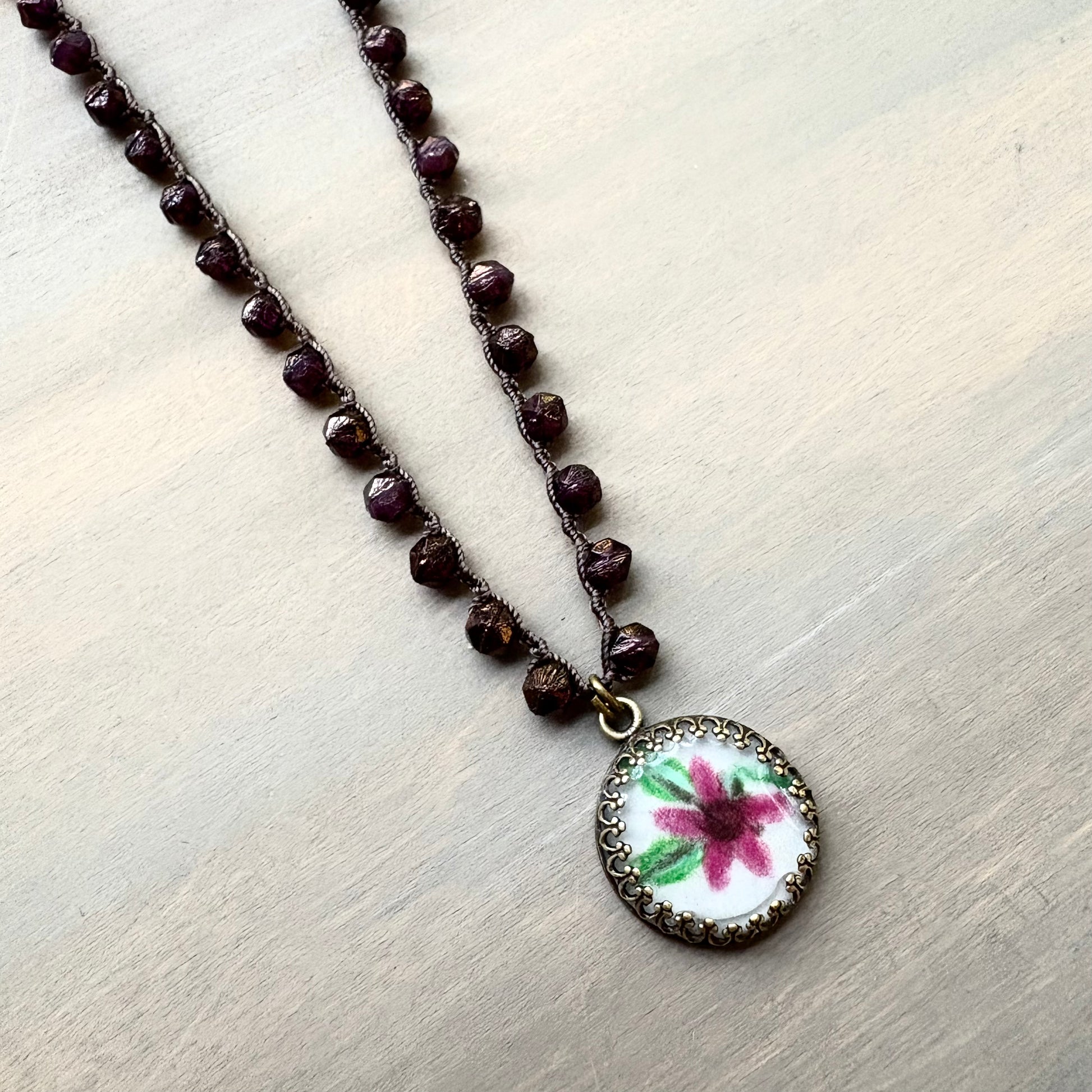 This necklace features a wee handpainted original by Maryellen. Strand measures about 17.5" long with button and loop toggle closure.