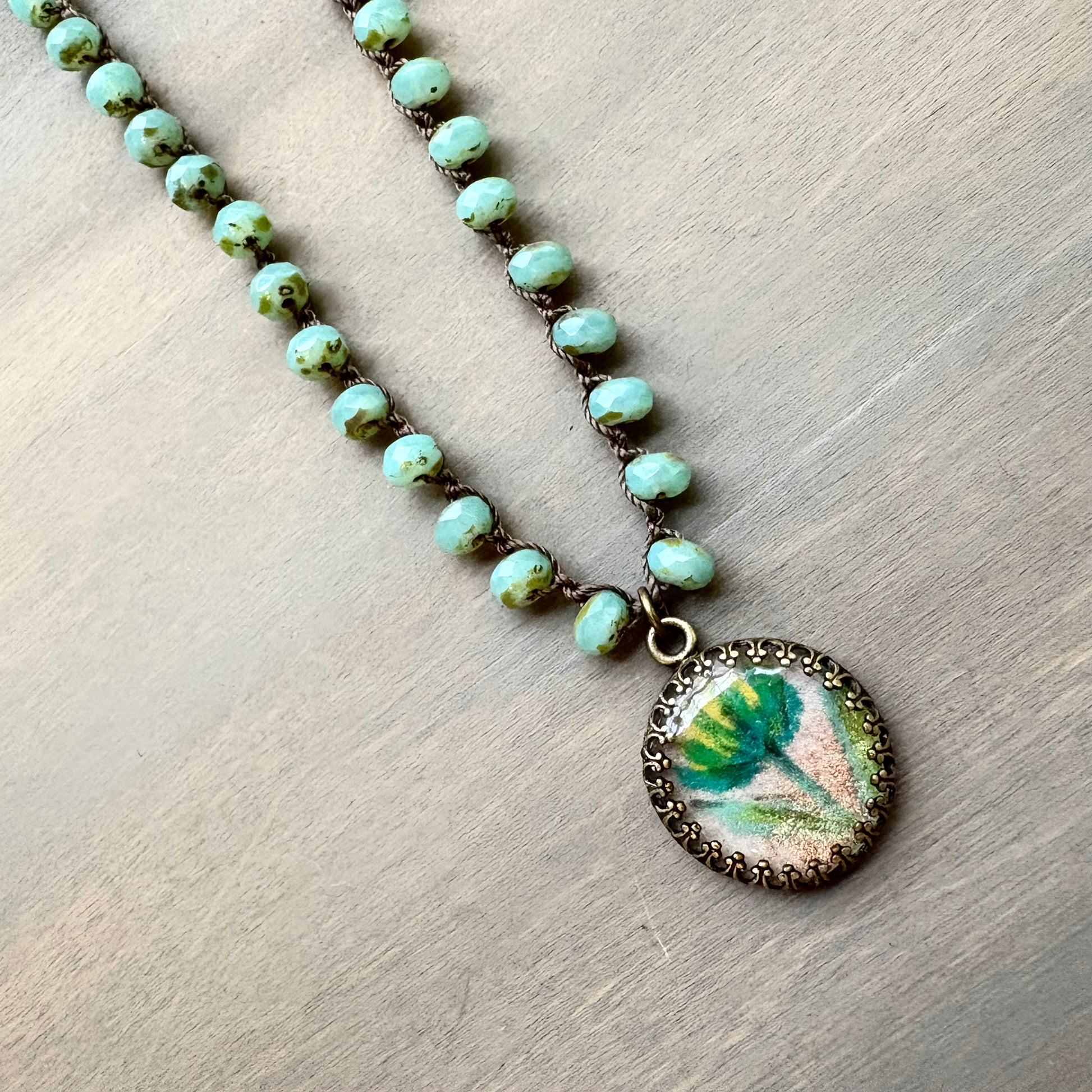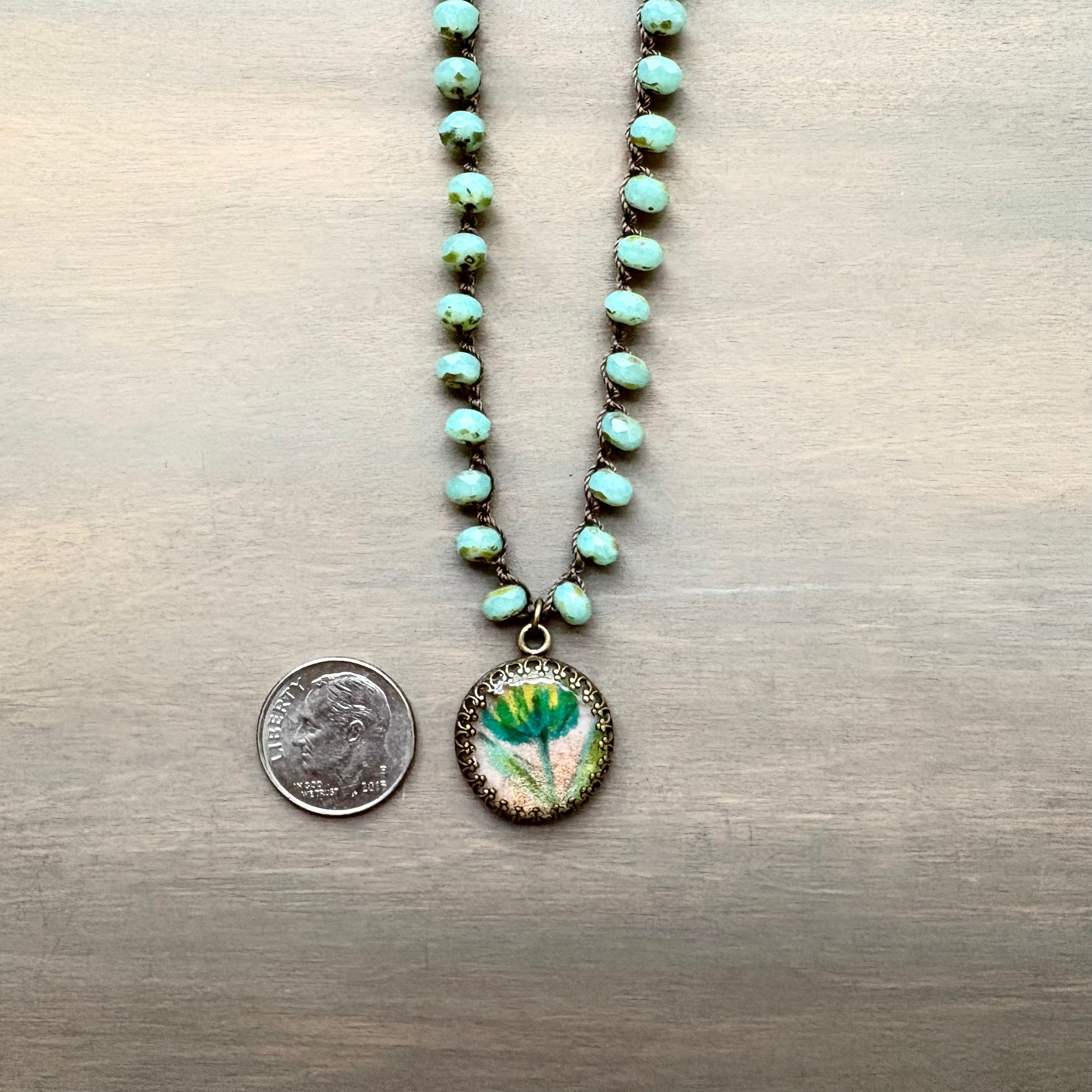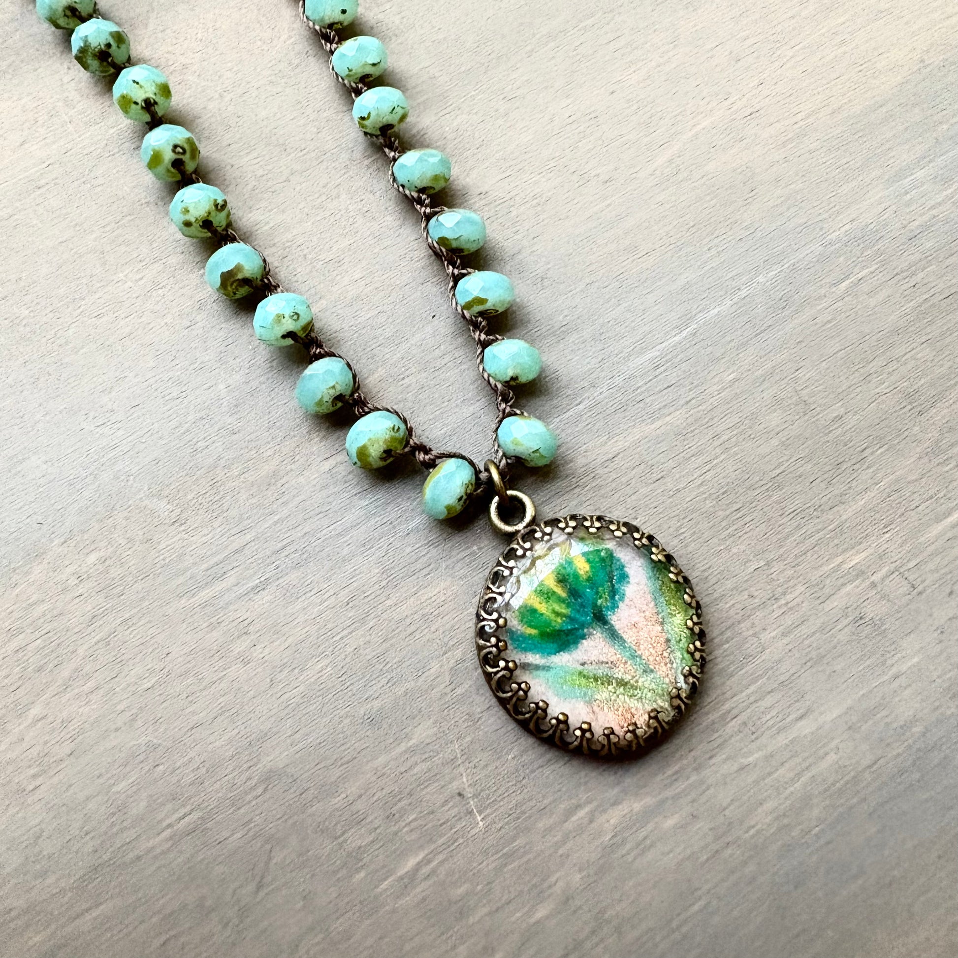 This piece features a wee piece of original art handpainted by Maryellen. About 17.5" long with button and loop toggle closure.