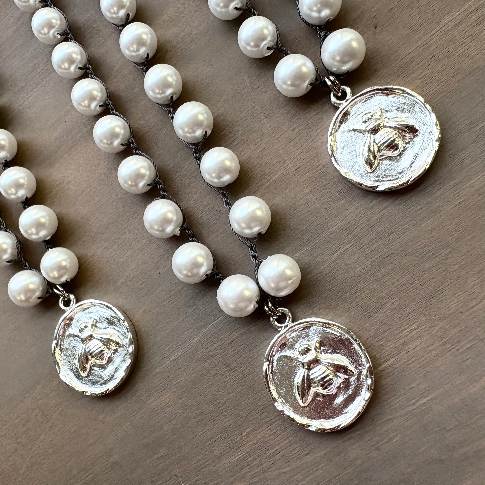 Silver Honey Bee Charm Necklace With Crocheted Glass Pearl Strand