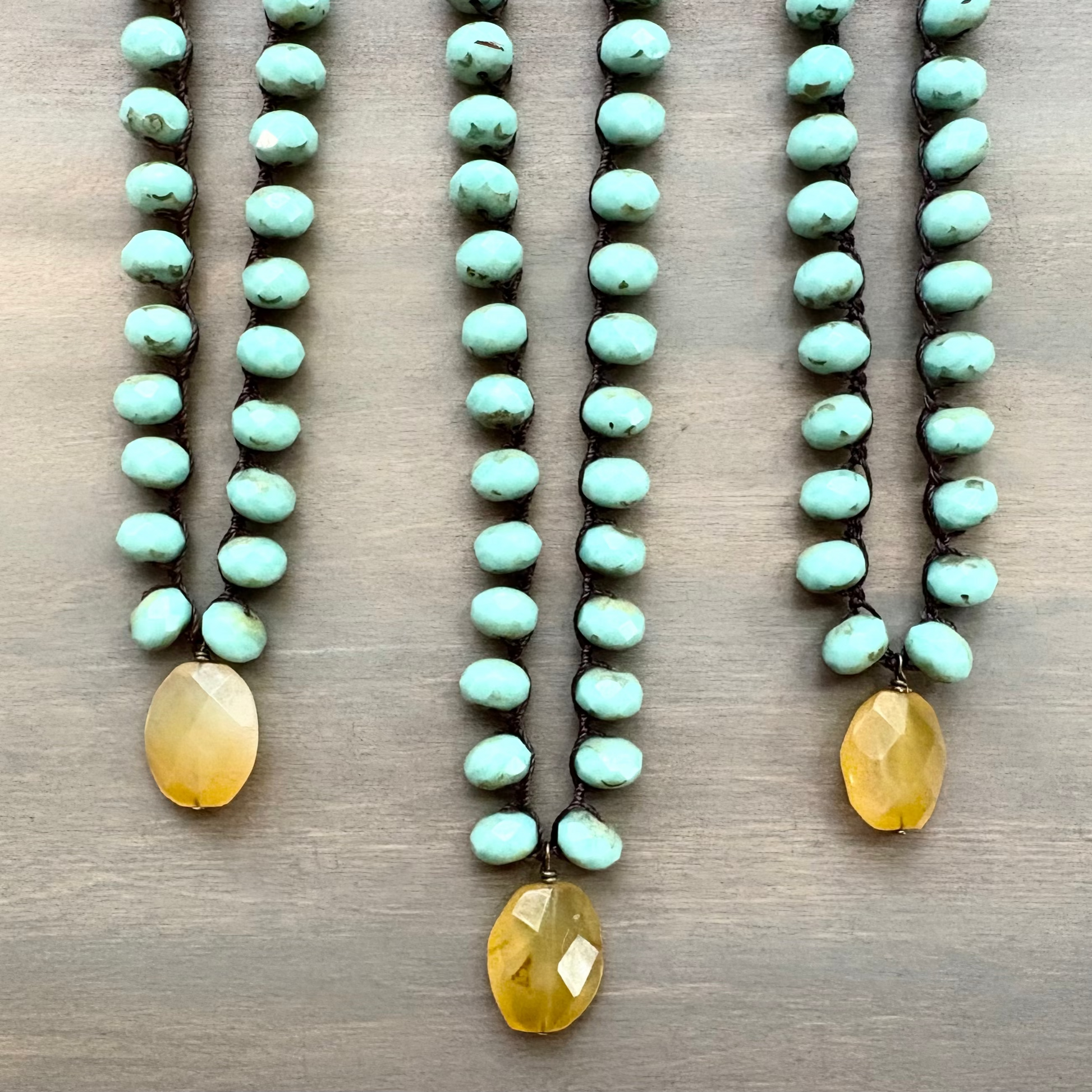I love this piece as a transitional necklace for fall. The warm honey tone of the faceted chalcedony paired with the cool aqua of the crocheted Czech crystal strand is one of my favorite combinations! About 17.5" long with mother of pearl button and loop toggle closure.