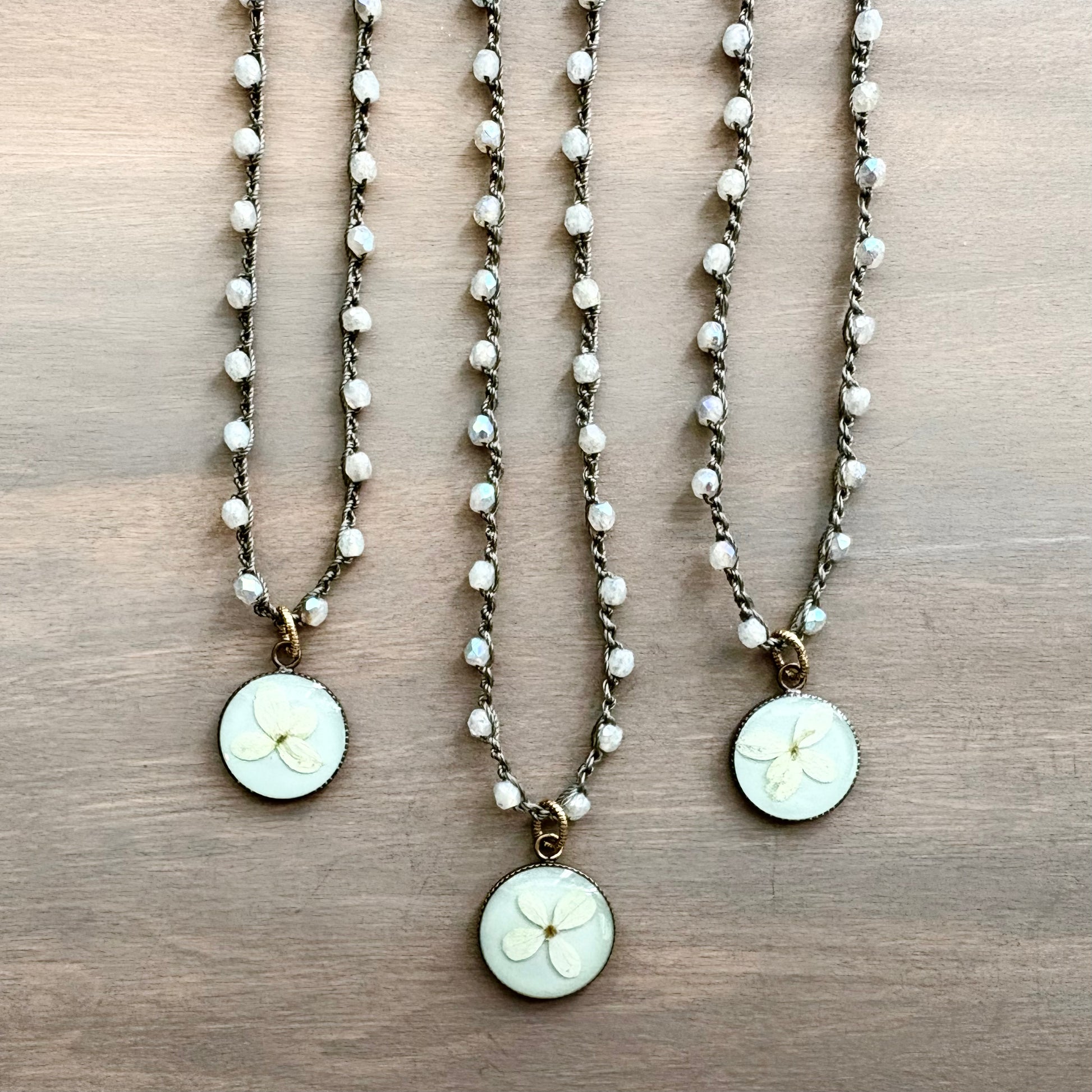 These necklaces feature real hydrangea blossoms that I picked and pressed in France while doing classes there this past summer. The sweet, dried floral is on a pale, sky blue background and matched the pendant with and crocheted strand of faceted opalescent Czech Crystal. Necklace measures about 17.5" long with button and loop toggle closure. Listing is for one necklace. This is a limited run of pieces.