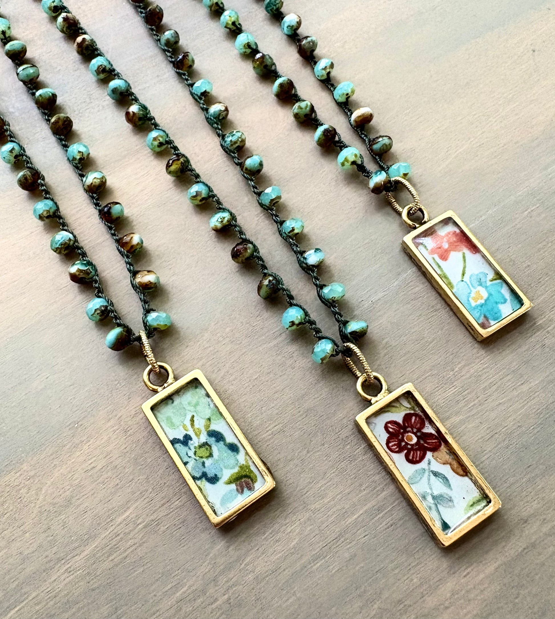 Each pendant is one of a kind, handcrafted by layering cotton lawn fabric from the famed Liberty Of London! I have paired each with an earthy Czech crystal in shades of aqua and warm brown, crocheted on super-strength, waterproof cording. Button and loop toggle closure. Listing is for one necklace. This is a limited collection. 18"