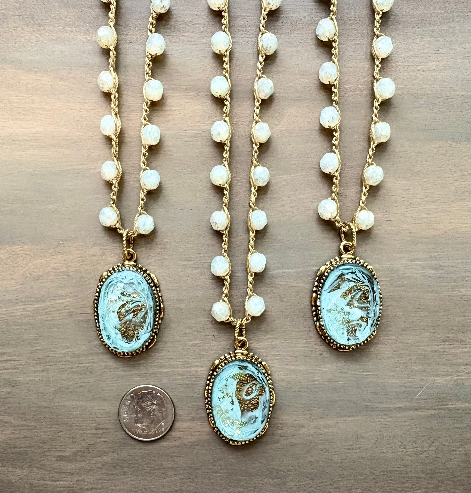 This handcrafted portal pendant, with layers of inky pigments and golden bubbles set in a handmade bezel is paired with a crocheted strand of faceted Czech crystal. Necklace measures 24” long with mother of pearl button and loop toggle closure. Listing is for one necklace. This piece looks great with the shorter companion piece in the Golden Surf set!