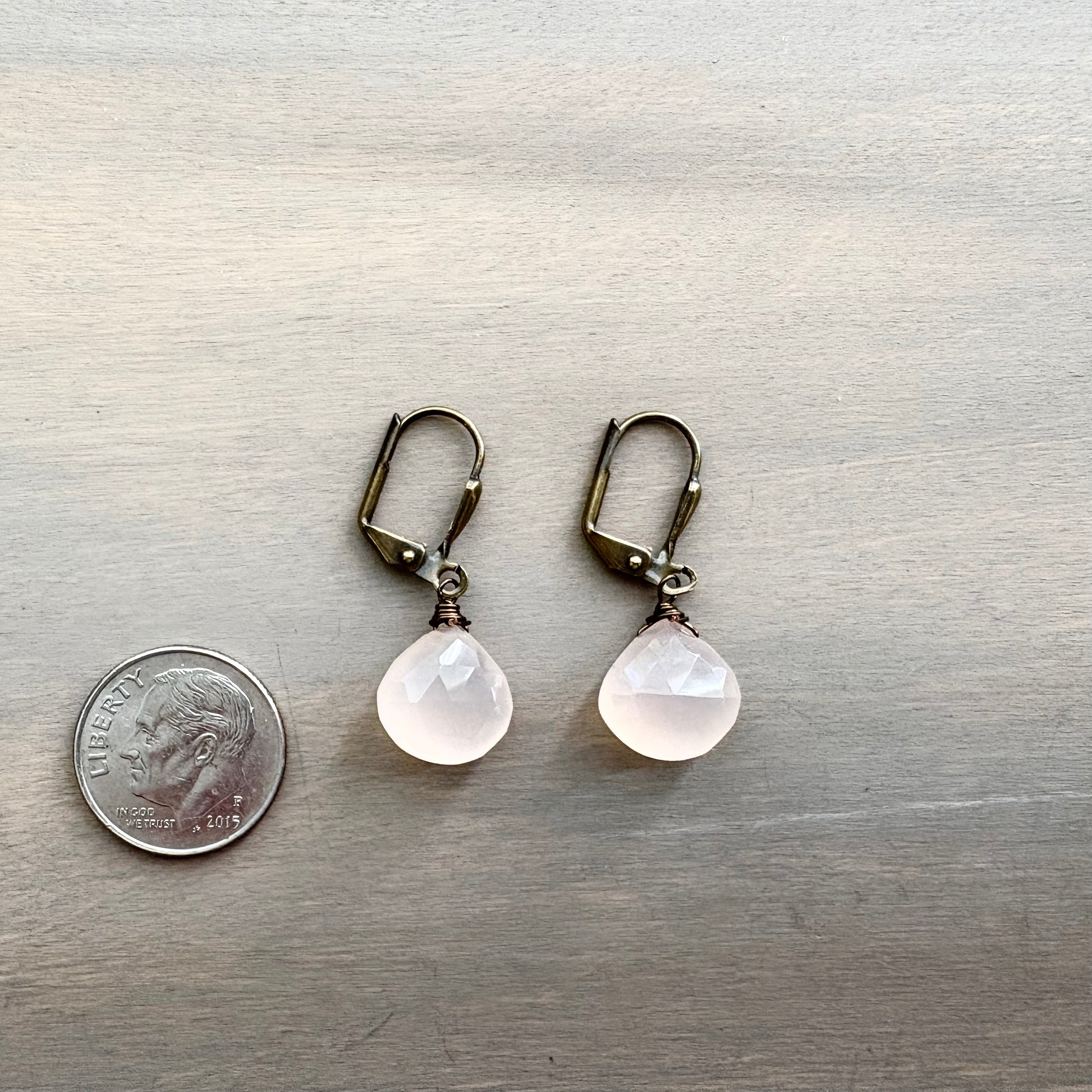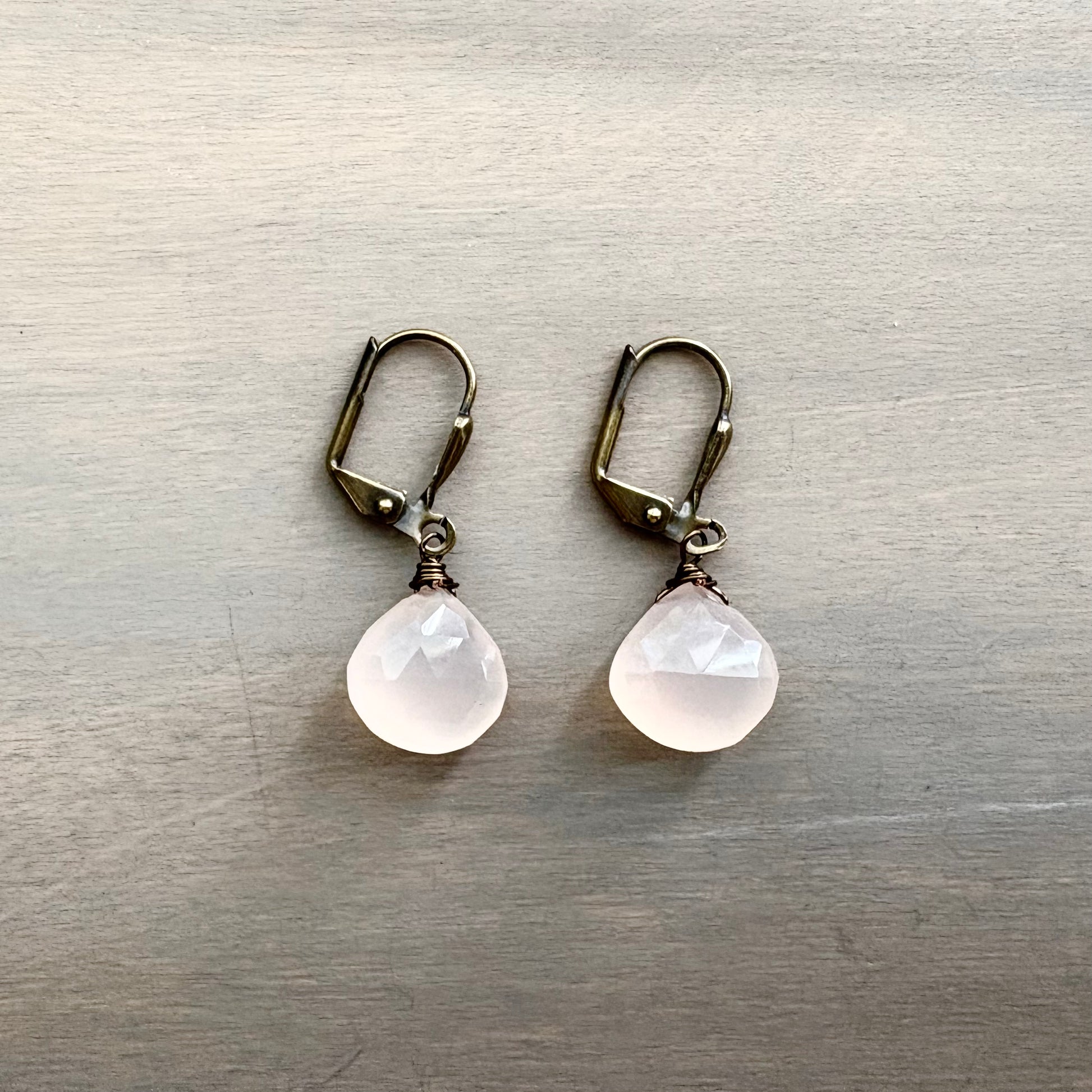 A lovely bit of soft peachy color and the richness of faceted semi-precious stones, these earrings are an easy to style to wear everyday. Little and light, the stones measure about 13mm, hang about half an inch. Please note that these are natural stones and the shape and color may vary slightly from pair to pair. Hooks are base metal, nickel and lead free, and come with backs.