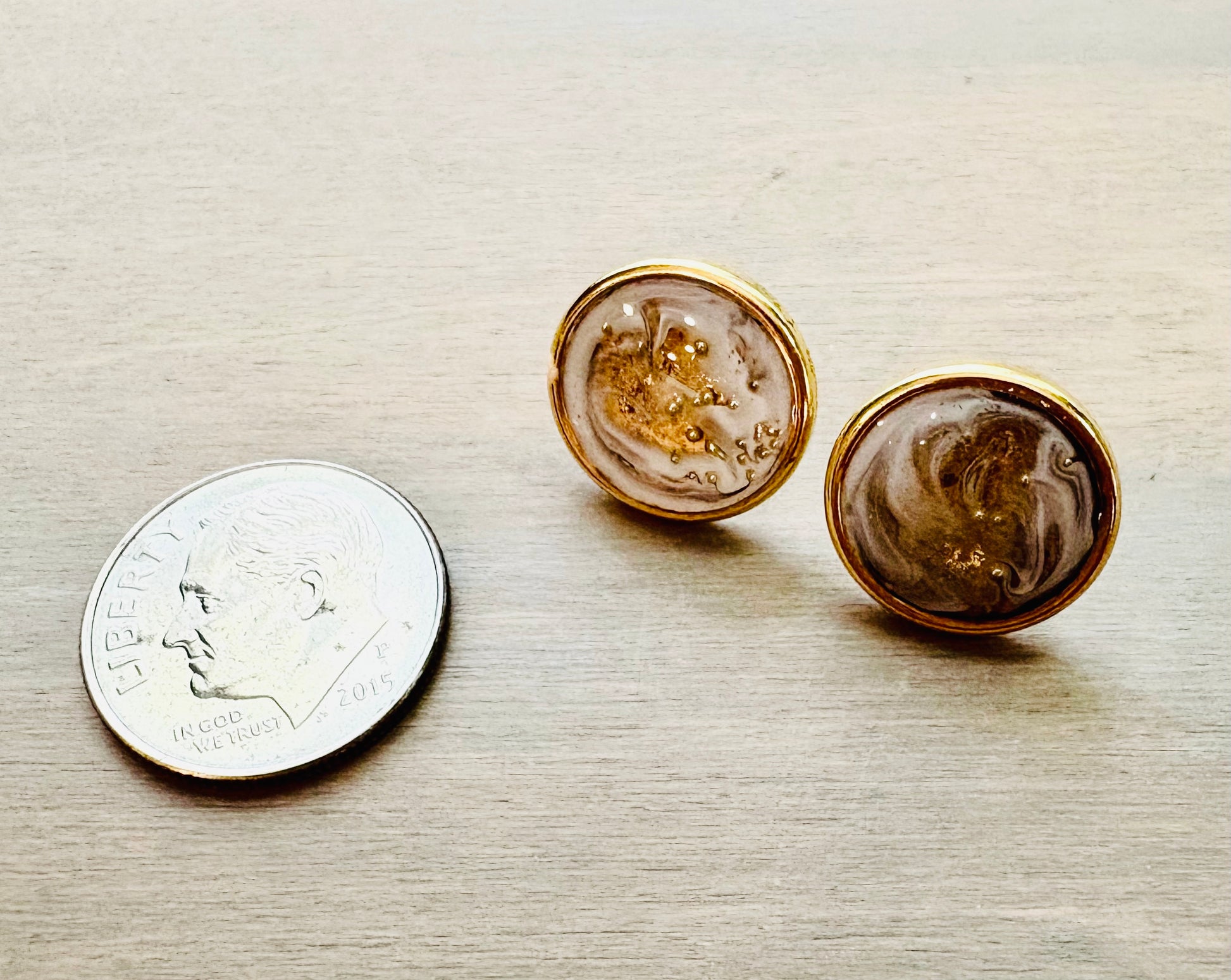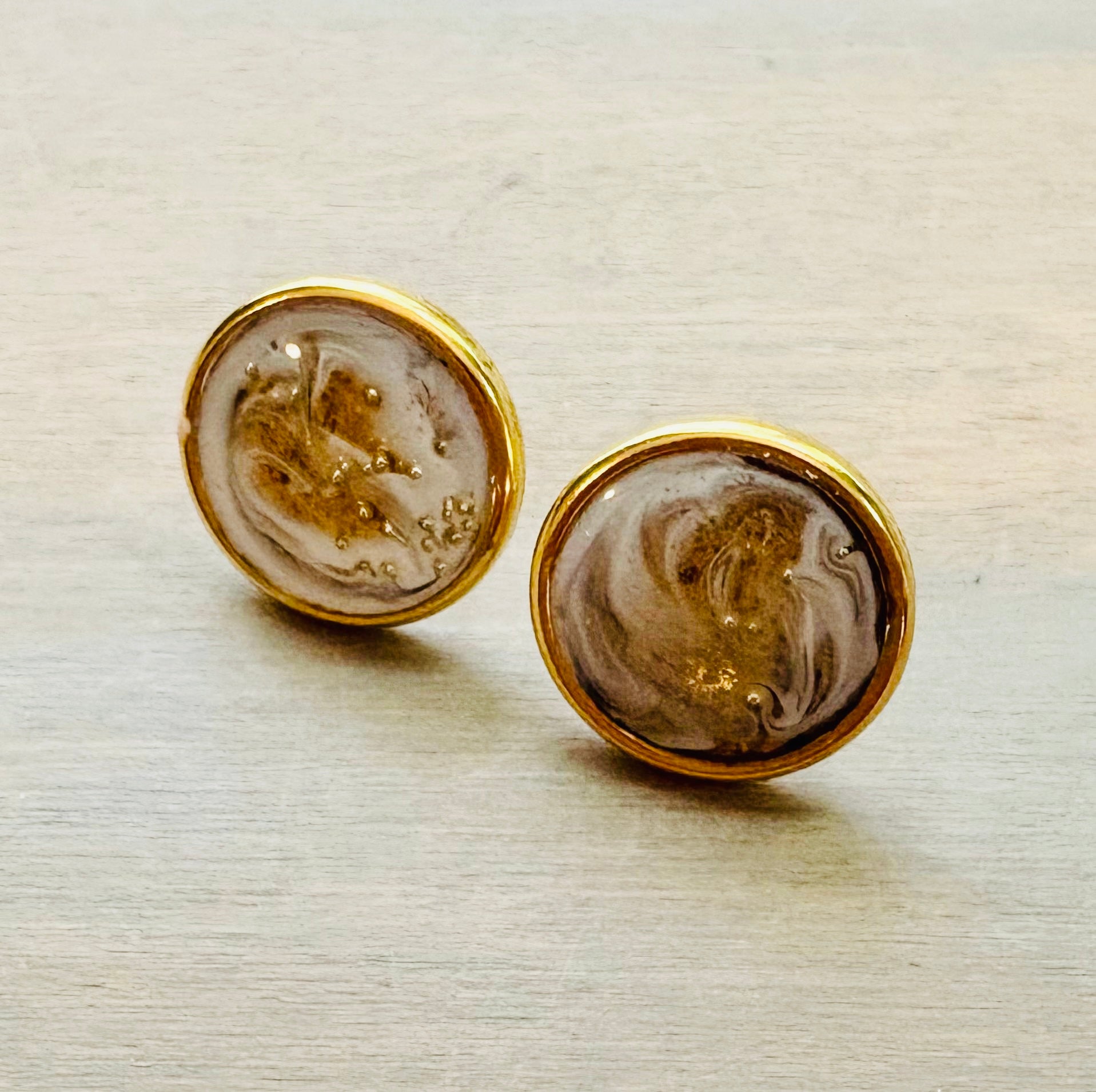 Gold plated stud earrings measure just under 1/2" diameter and feature one-of-a-kind designs I create by layering pigments and gold flake. They are the perfect neutral with just a hint of ivory pearl. Earrings come carded, with backs.