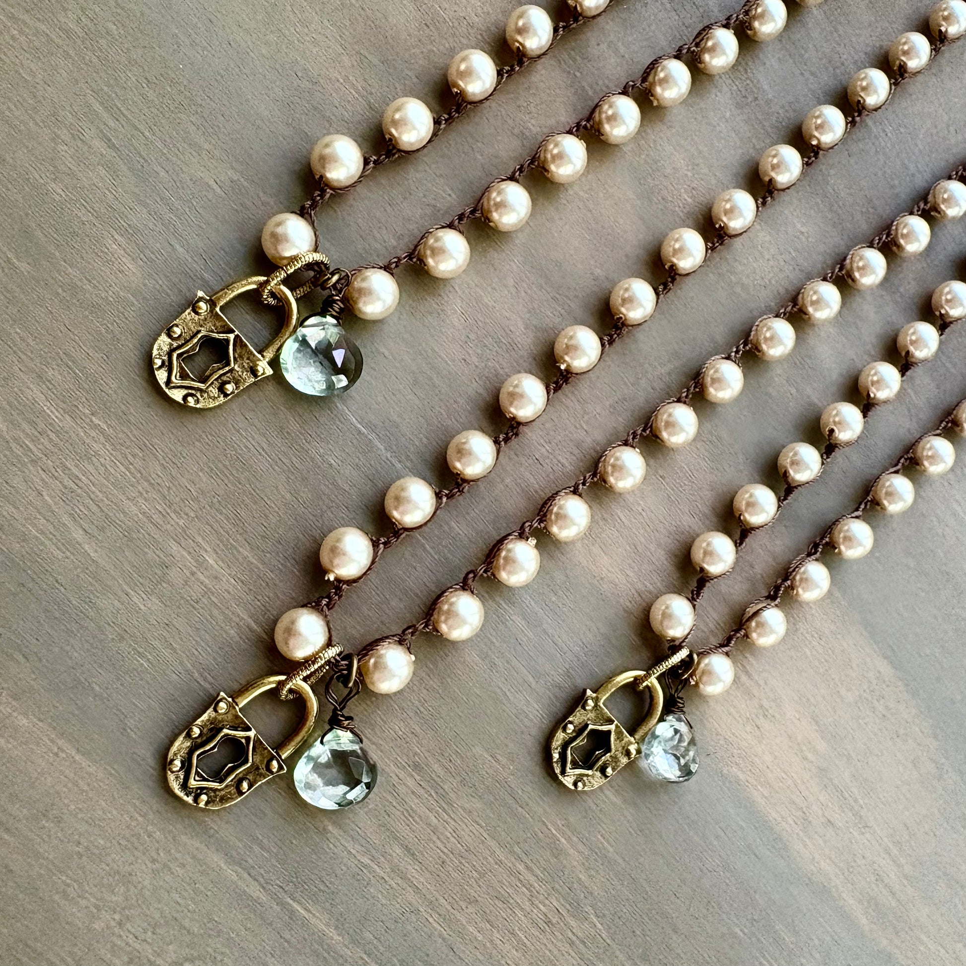 Classic and modern all at once. A trendy padlock charm is paired with fine cut of faceted green quartz and matched with ivory glass pearls. Necklace measures about 18" with button and loop toggle closure. Listing is for one necklace.