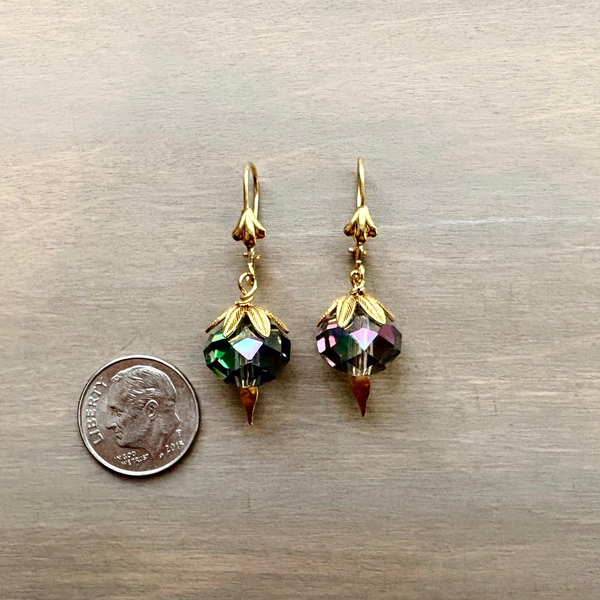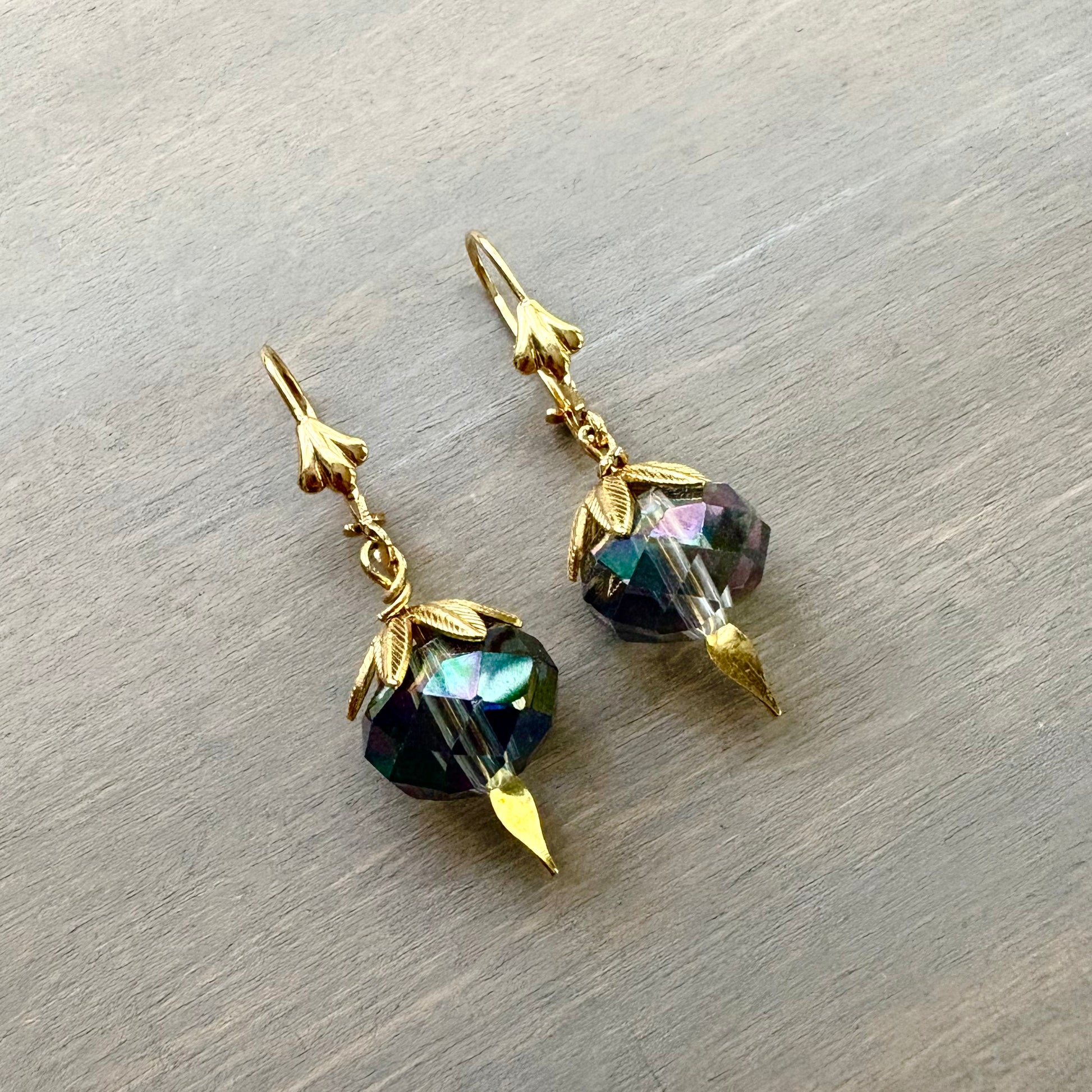 These amazing cut crystal earrings are a color that is hard to nail down. They are a greyish blue, but catch the light to seem much deepers sometimes. A perfect neutral shade, with glimmering gold and gold plated lever back hooks. Listing is for one pair. Earrings come carded.