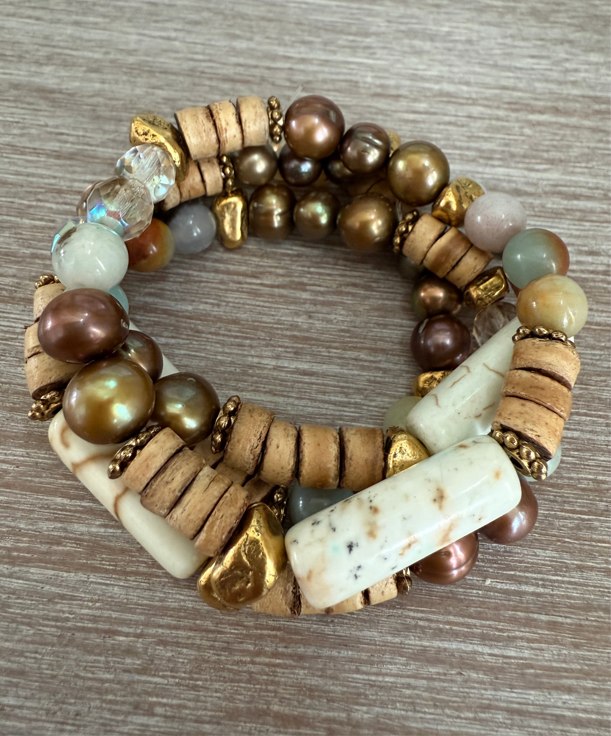 Mixing up so many textures! I’ve mixed in shining golden nuggets, wood, semi precious stones, crystals and freshwater pearls. These colors are like a coastal marsh in the fall - hints of blue or green maybe, but those earthy browns and golden autumn tones are more predominant. Fit wrist sizes 6 to 8 inches. Sold individually.