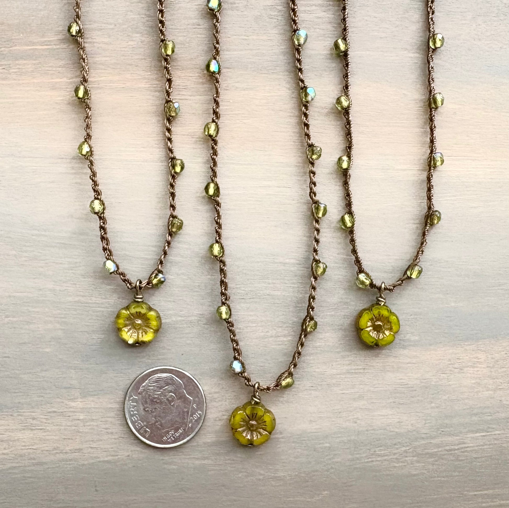 crocheted in a dainty strand and features a wee olivine, cut glass flower with a light wash of gold. The flower, created from antique glass molds, measures just over .25" in diameter and necklace is about 17.5" long, with button and loop toggle closure. Listing is for one necklace. Matching earrings available in separate listing.