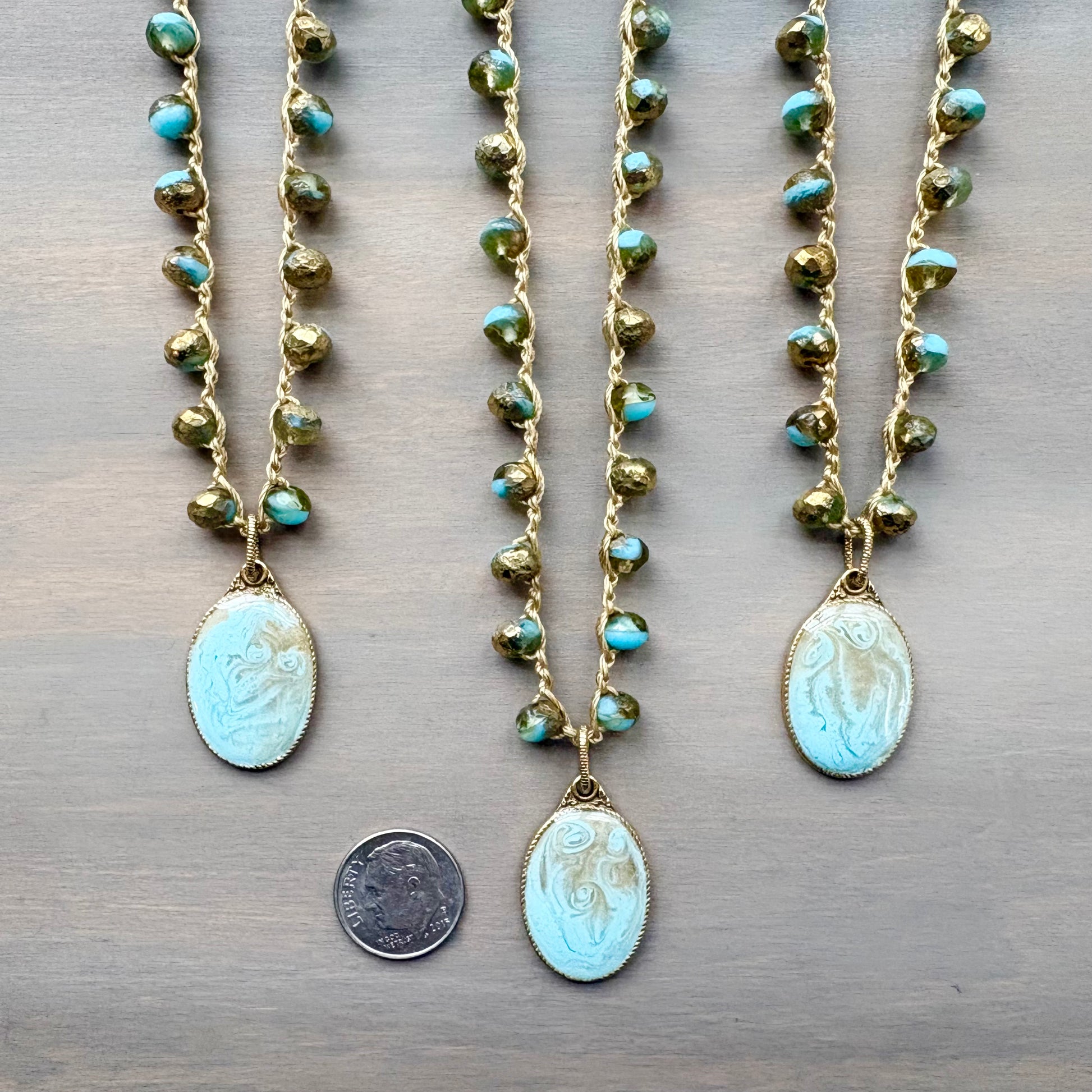Each portal pendant is an individual piece of art! I paint layers of pigment, German glitter, and gold flake under a glassy surface to create unique designs. Bubbles and striations add to each piece. These pendants are paired with a faceted Czech crystal in soft aqua with a mottled glaze of gold to add just a bit more shimmer. Button and loop toggle closure, each crocheted necklace is about 18" long. Listing is for one necklace.