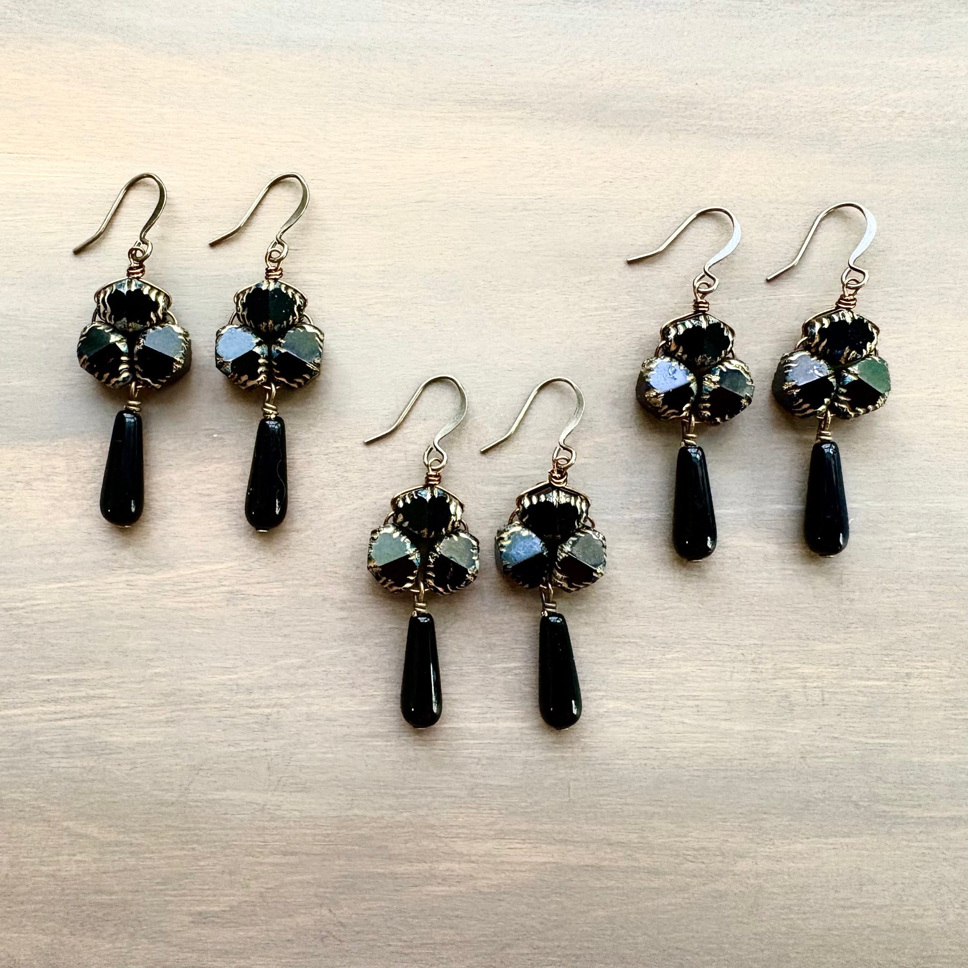 Faceted Czech crystal in jet black and golden detail with faceted glass drop on hypoallergenic French hooks with backs. Listing is for one pair.
