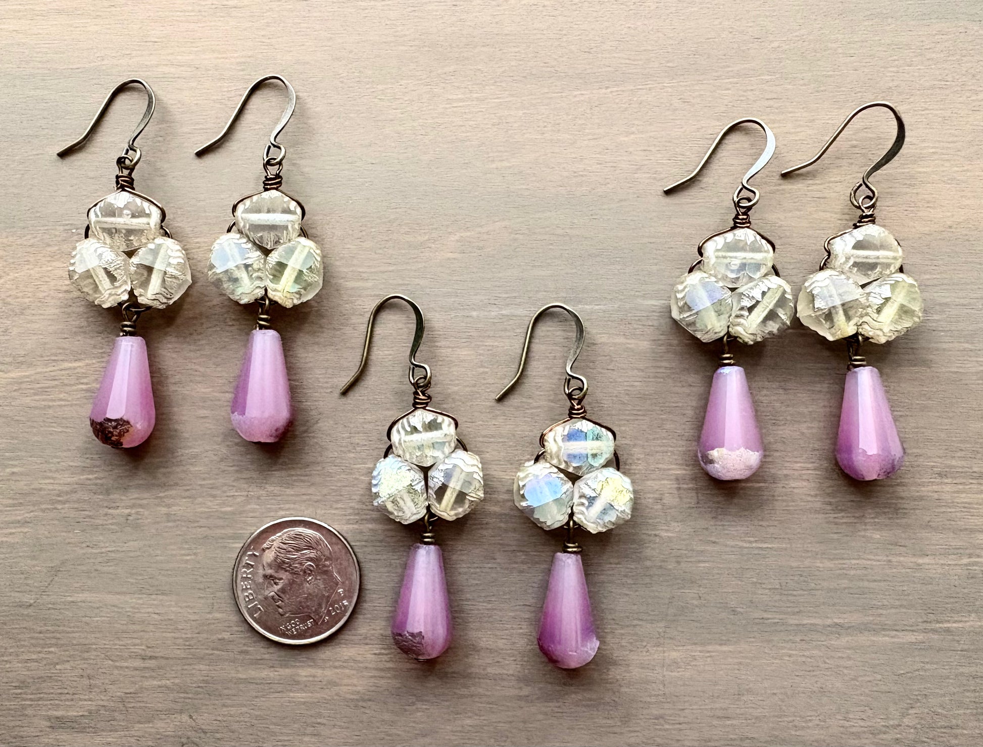 Faceted Czech crystal in shimmering opal tones with a shimmering raspberry faceted glass drop on hypoallergenic French hooks with backs. Perfect for summer cocktail parties and weddings! Listing is for one pair.