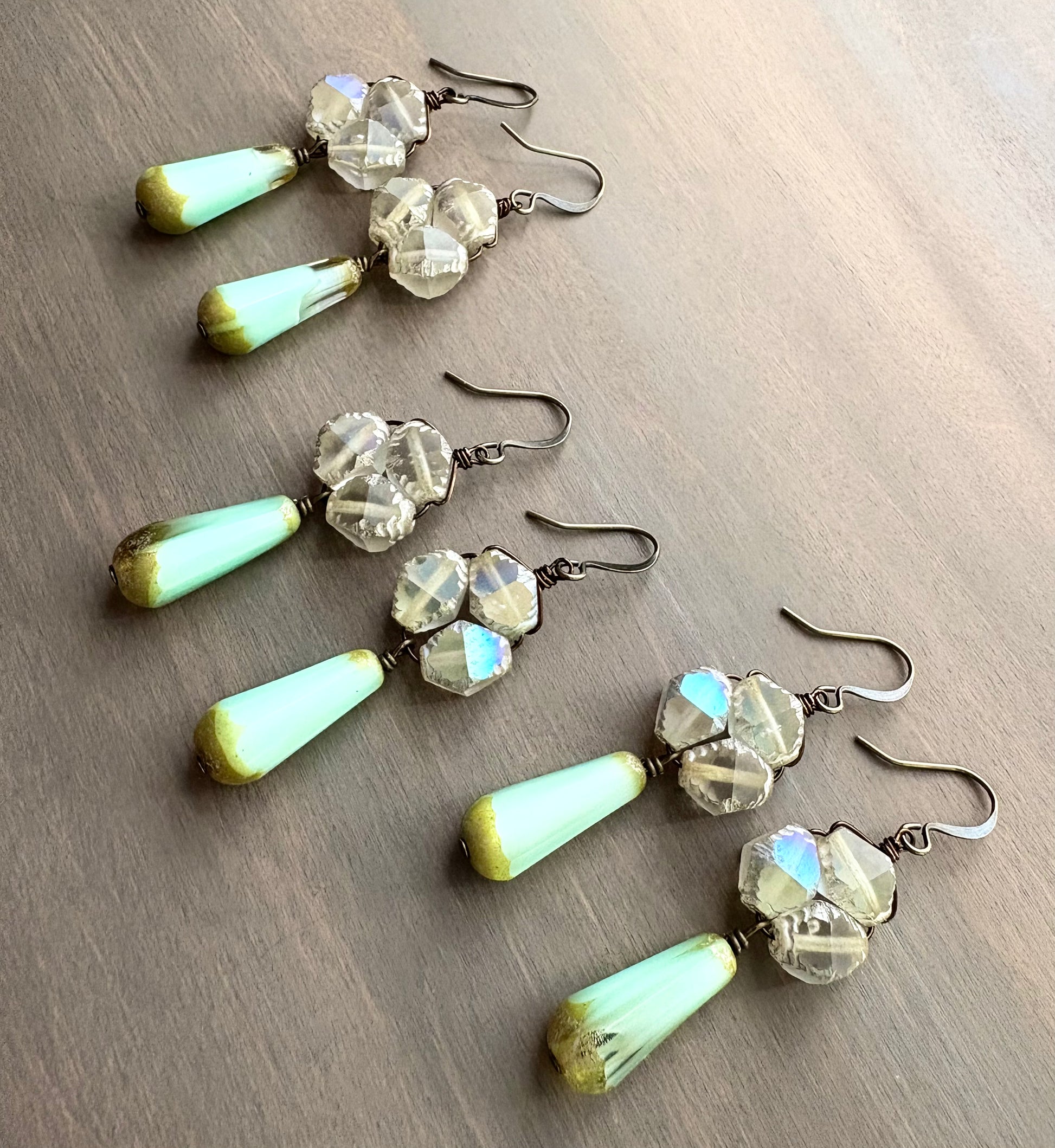 Faceted Czech crystal in shimmering opal tones with a soft green faceted glass drop on hypoallergenic French hooks with backing piece. Perfect for summer cocktail parties and weddings!