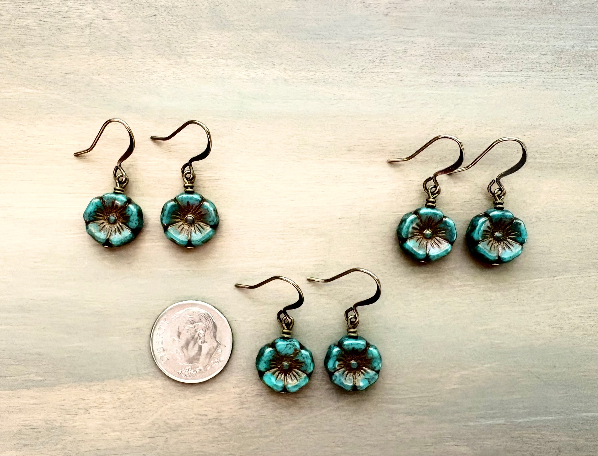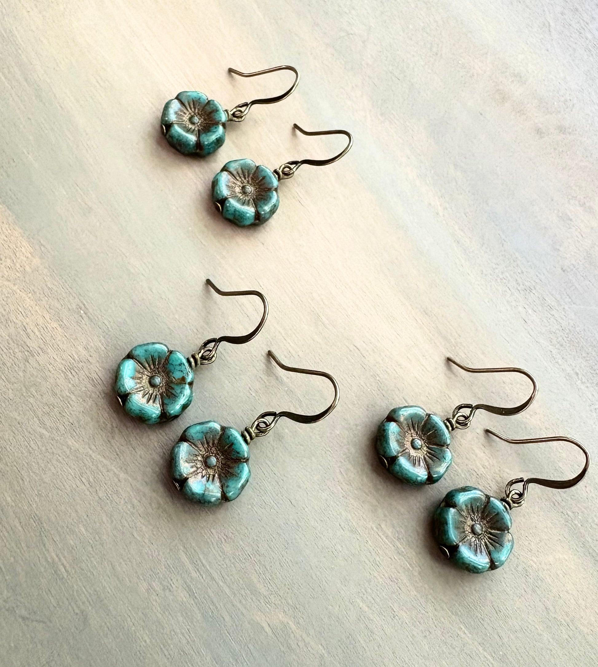 These beautiful, vintage style pressed glass flower earrings are created from vintage glass molds in the Czech Republic. I love them in this blue spruce shade! Just the prettiest color for fall! Hypoallergenic, nickel and lead free hooks with backs. Earrings arrive carded. Listing is for one pair.